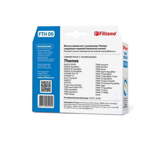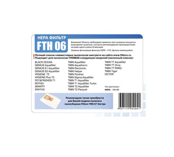 Фильтр НЕРА FILTERO FTH 06 05294 обеспечивает эффективную фильтрацию воздуха и задерживает мельчайшие частицы пыли и аллергенов, проникающие из пылесоса на поверхность. Фильтр немоющийся и подлежит замене спустя 6 месяцев эксплуатации. Уровень фильтрации - НЕРА Н 10.