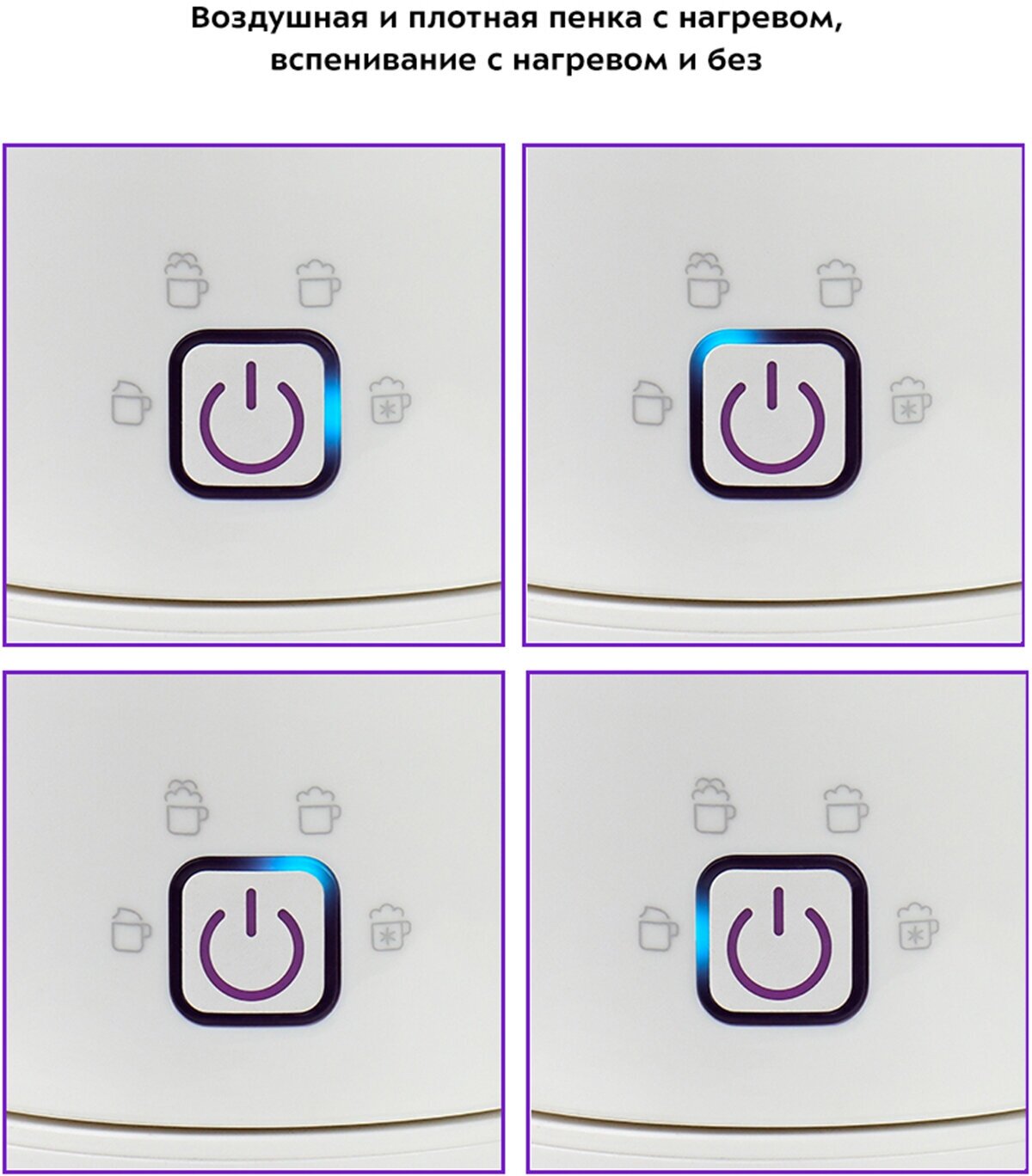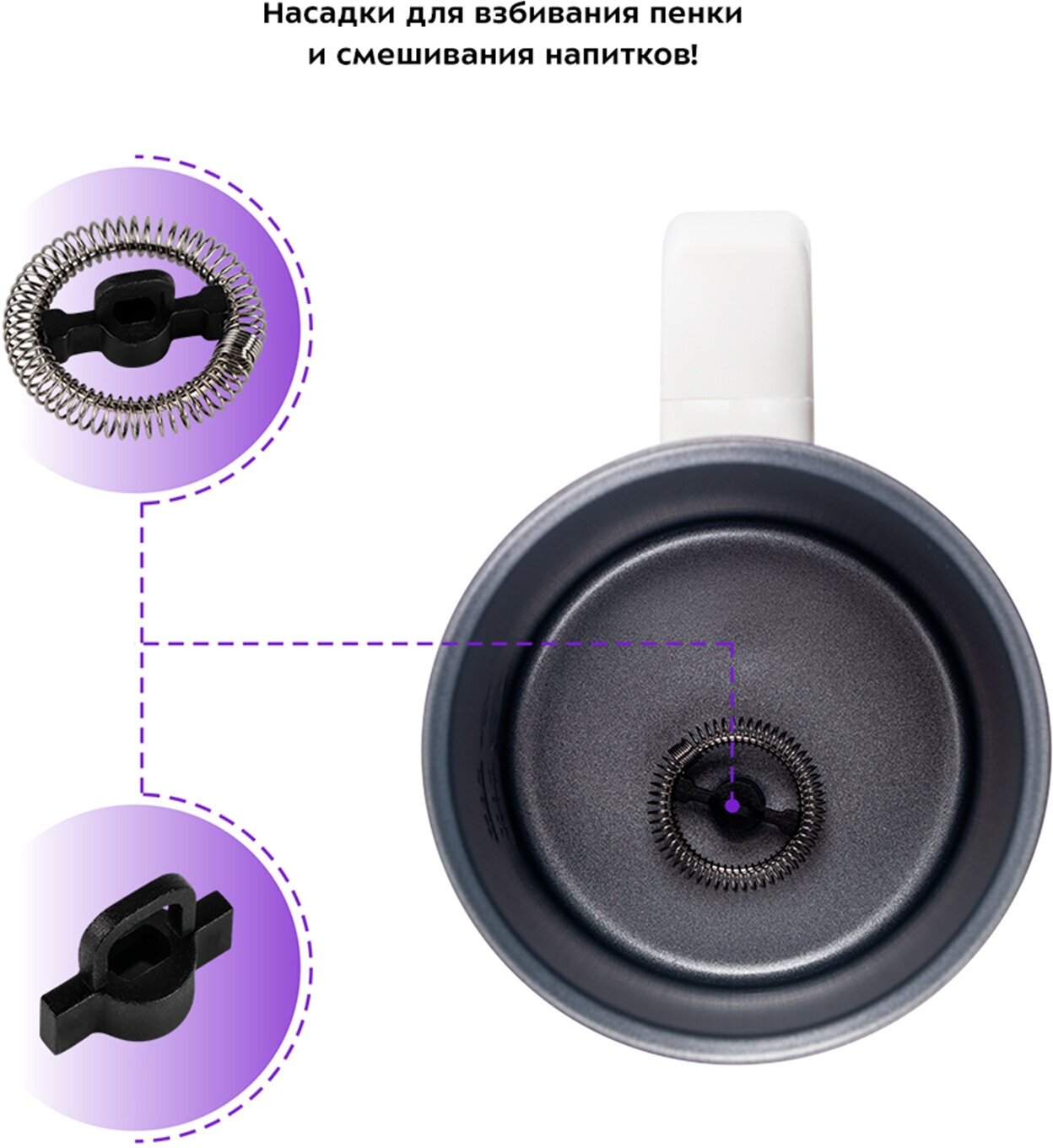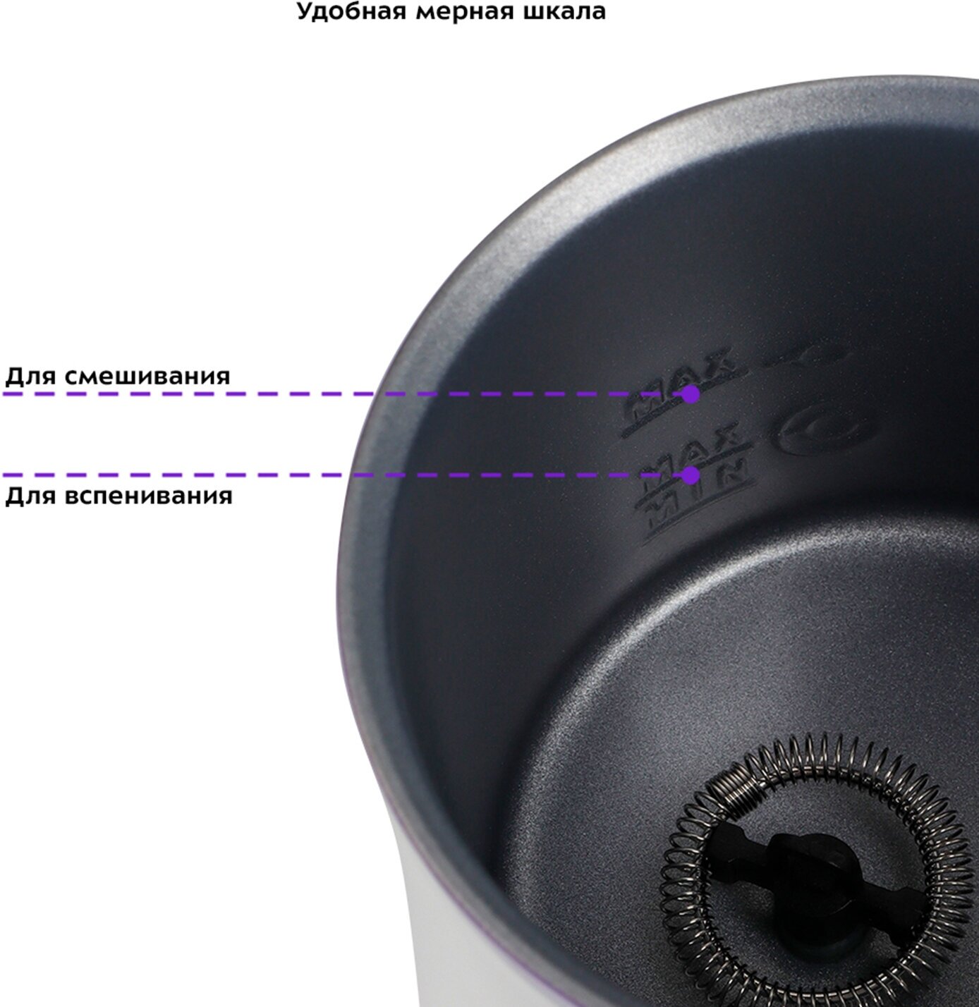 Капучинатор автоматически отключается, когда процесс вспенивания или смешивания выполнен. В комплекте 2 насадки: для вспенивания и смешивания. Через прозрачную крышку можно наблюдать за приготовлением.