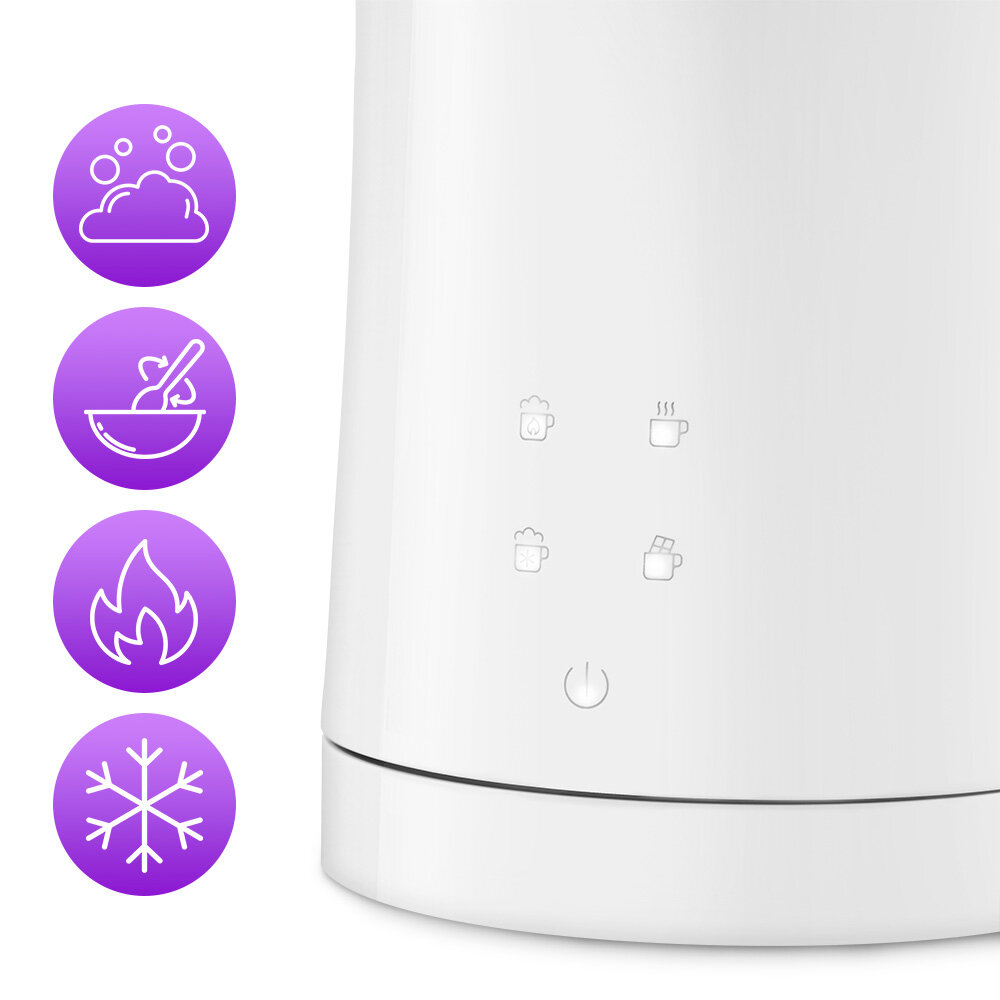 Прибор работает в 4 режимах: вспенивание и смешивание с подогревом, холодное вспенивание, какао. Для каждого режима задана определённая скорость вращения насадки и время приготовления.