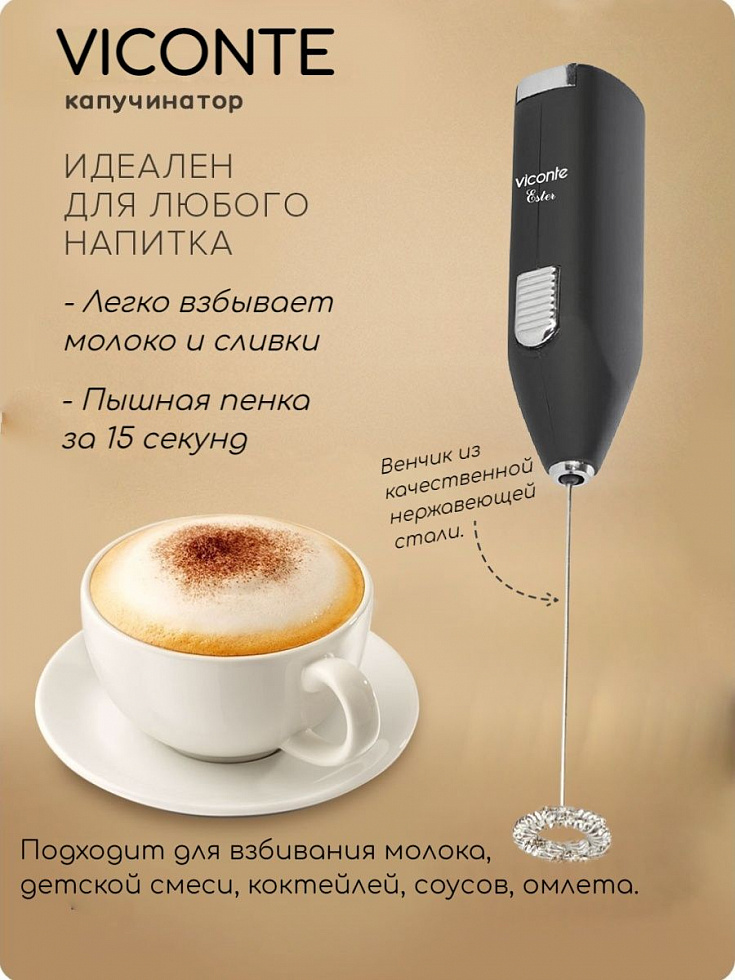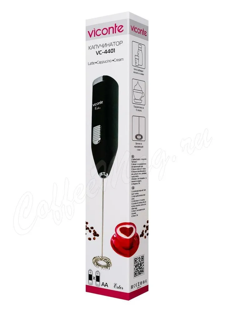 Капучинатор Viconte VC-4401, мощность 3W. Питание 2хАА батарейки. Удобный корпус с покрытием "soft-touch", венчик из высококачественной нержавеющей стали.