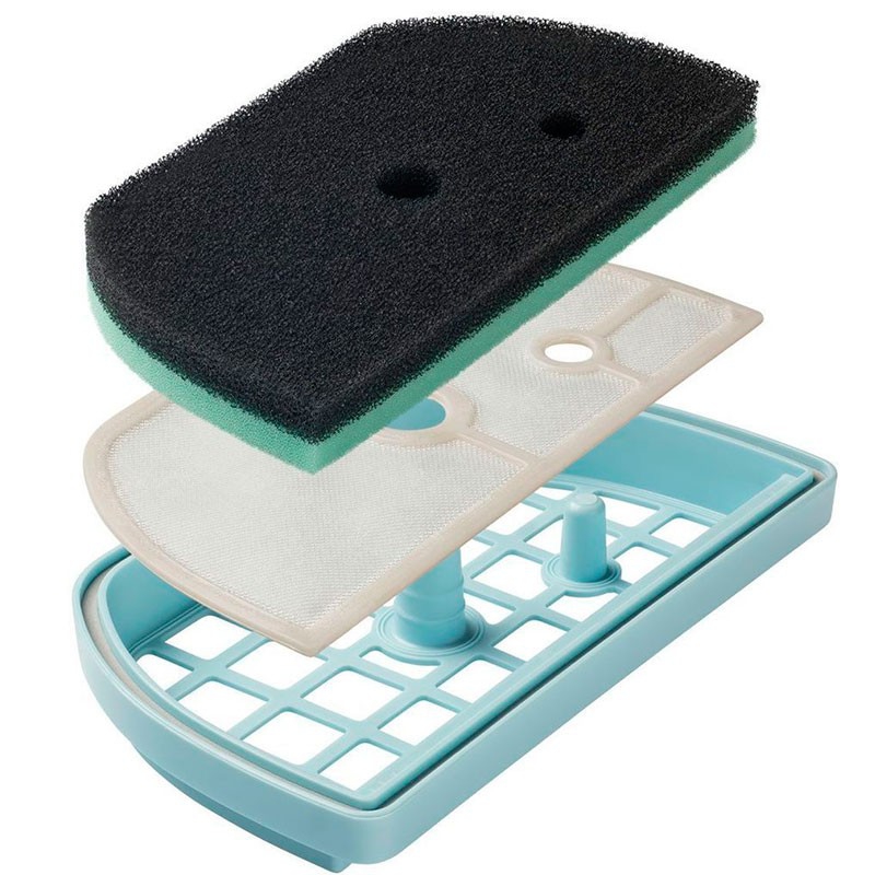 В наборе 3 предмета: поролоновый фильтр, сетчатый фильтр и пластиковый контейнер.