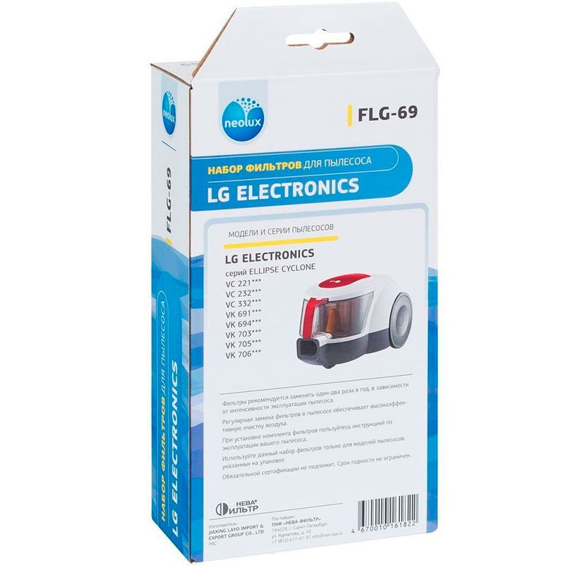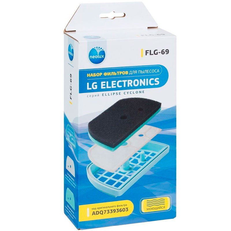 Набор моторных фильтров Neolux FLG-69 предназначен для пылесосов LG серий: Ellipse Cyclone VC 221.., VC 232.., VC 332.., VK 691.., VK 694.., VK 703.., VK 705.., VK 706... Код оригинального фильтра ADQ73393407