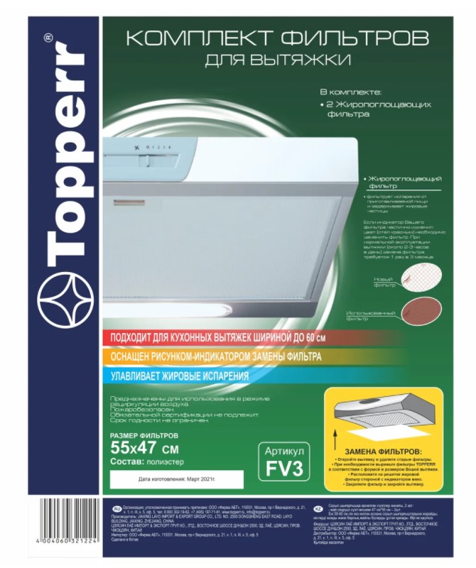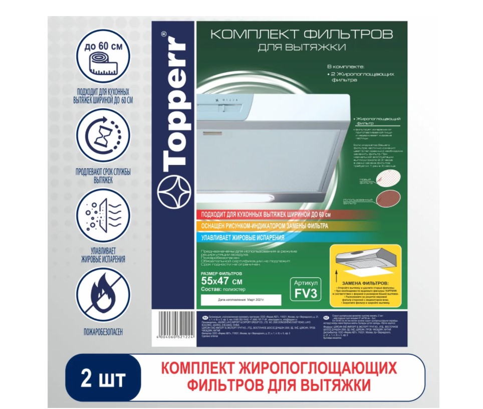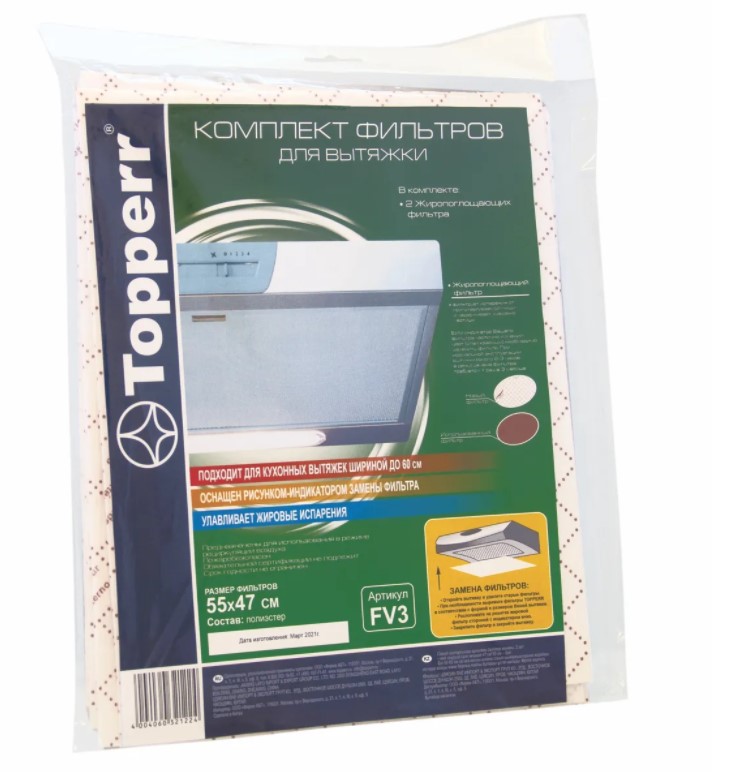 В наборе 2 предмета: два жиропоглощающих фильтра размером 57-47 см с индикатором Topperr, как только фильтр изменит свой цвет с серого на красный – произведите замену фильтра.Комплект подходит к любым кухонным вытяжкам шириной 50-60 см, улавливает все жировые испарения. Пожаробезопасен