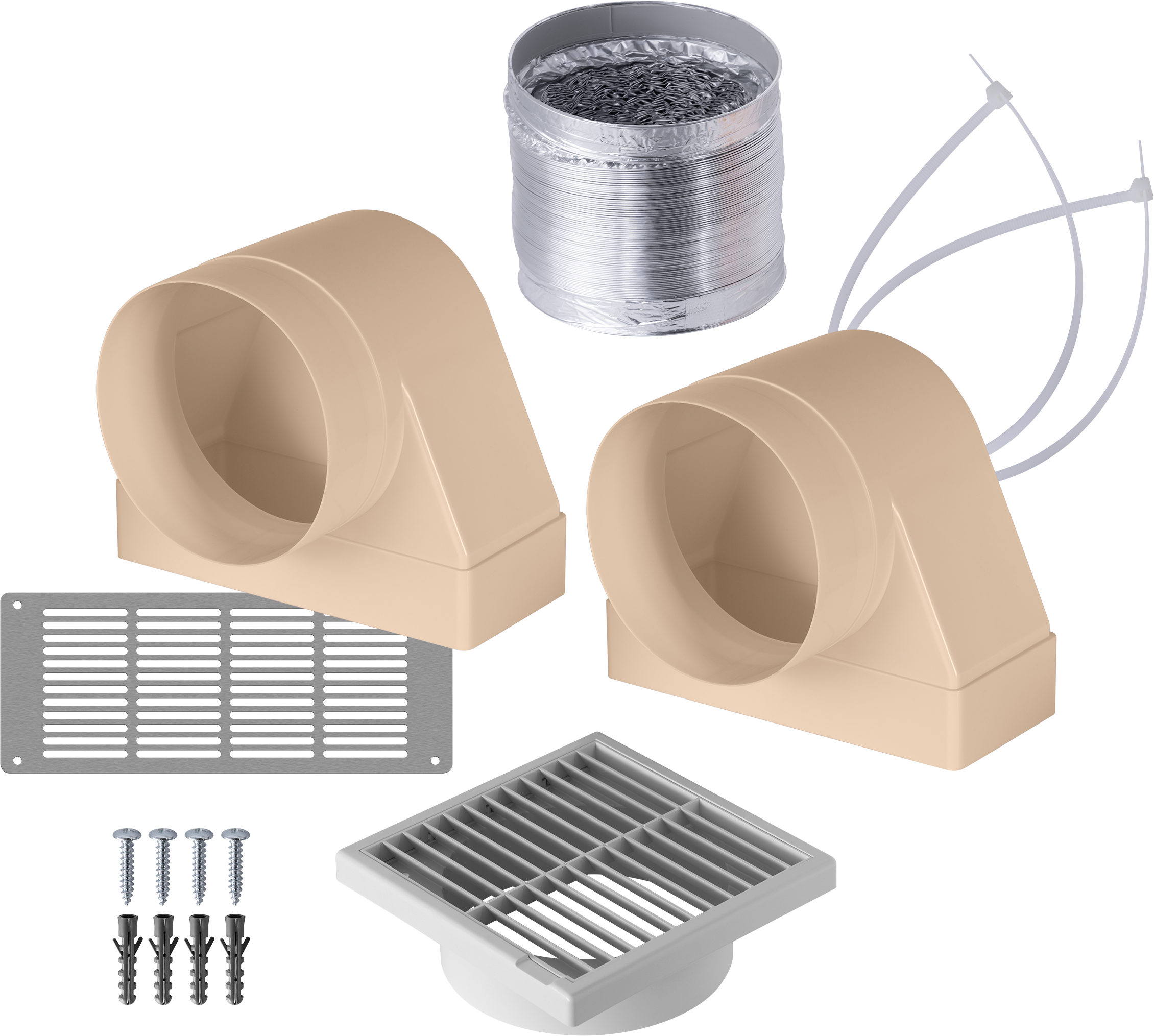 В комплектации: воздуховод пластиковый 150мм – 1 шт.;переходник с прямоугольной трубы (220х90мм) на круглую (150мм) – 2 шт.;сетка (решетка 220х90мм) – 1 шт., гофра
