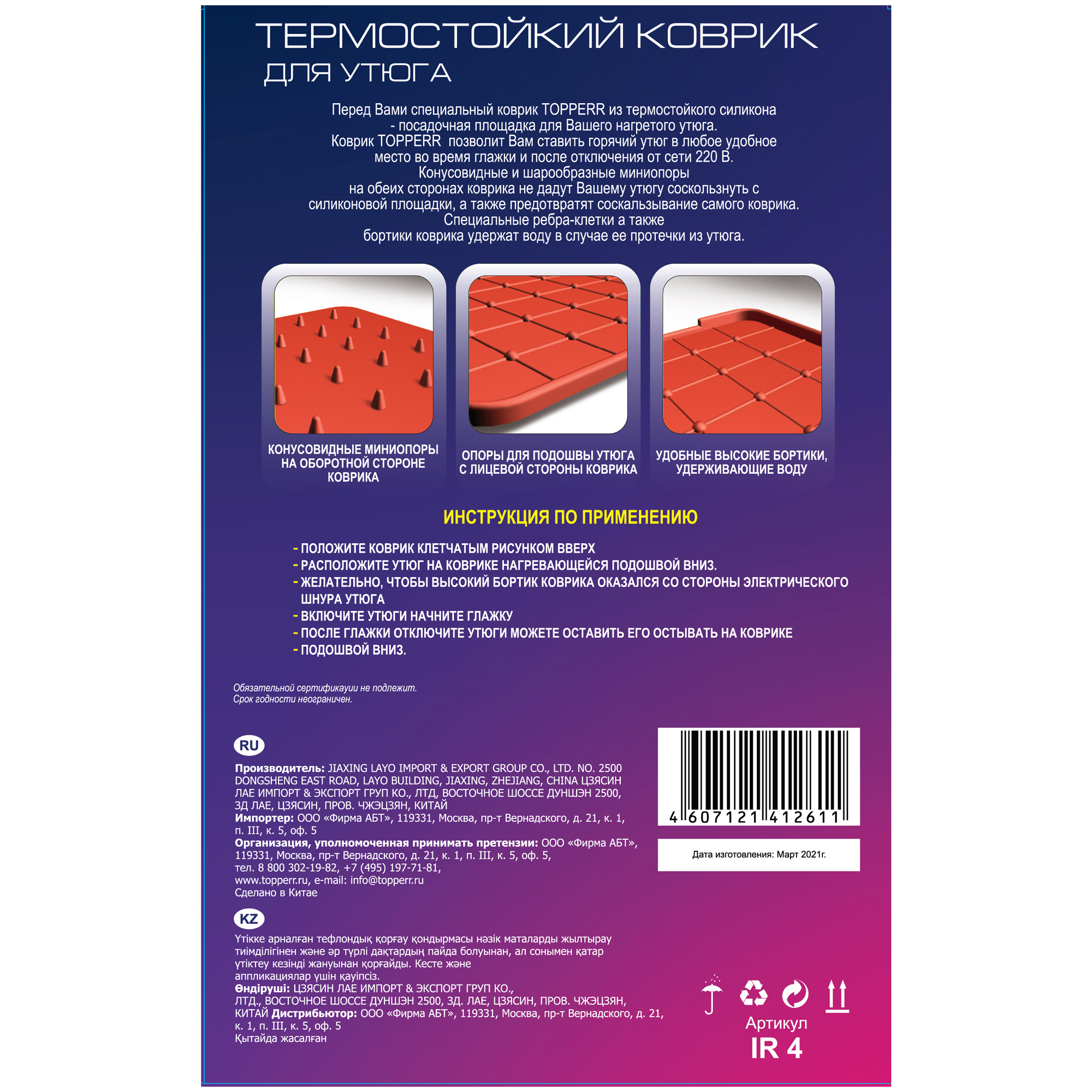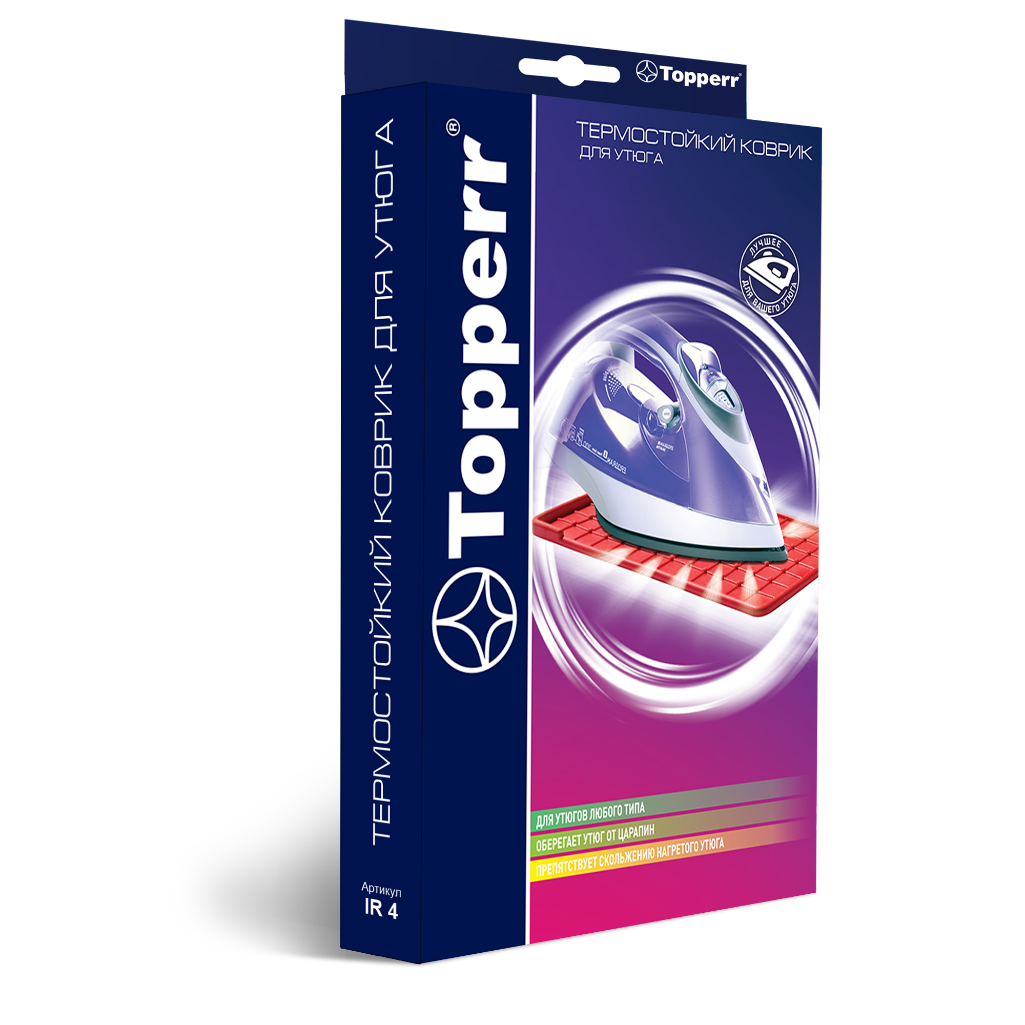 Коврик Topperr позволит вам ставить горячий утюг в любое удобное место во время глажки и после отключения от сети 220 В.Конусовидные и шарообразные миниопоры на обеих сторонах коврика не дадут вашему утюгу соскользнуть с силиконовой площадки, а также предотвратят соскальзывание самого коврика.