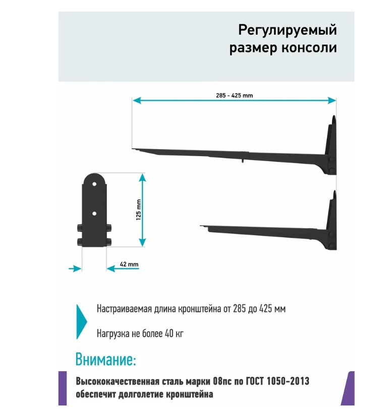 Кронштейн подходит для крепления бытовой техники массой до 40 кг, максимальная нагрузка подтверждена многочисленными лабораторными испытаниями. В производстве мы используем высокопрочную сталь и порошковую покраску, поэтому продукт отличается высокой устойчивостью к механическим повреждениям, коррозии, а также деформации и износу.