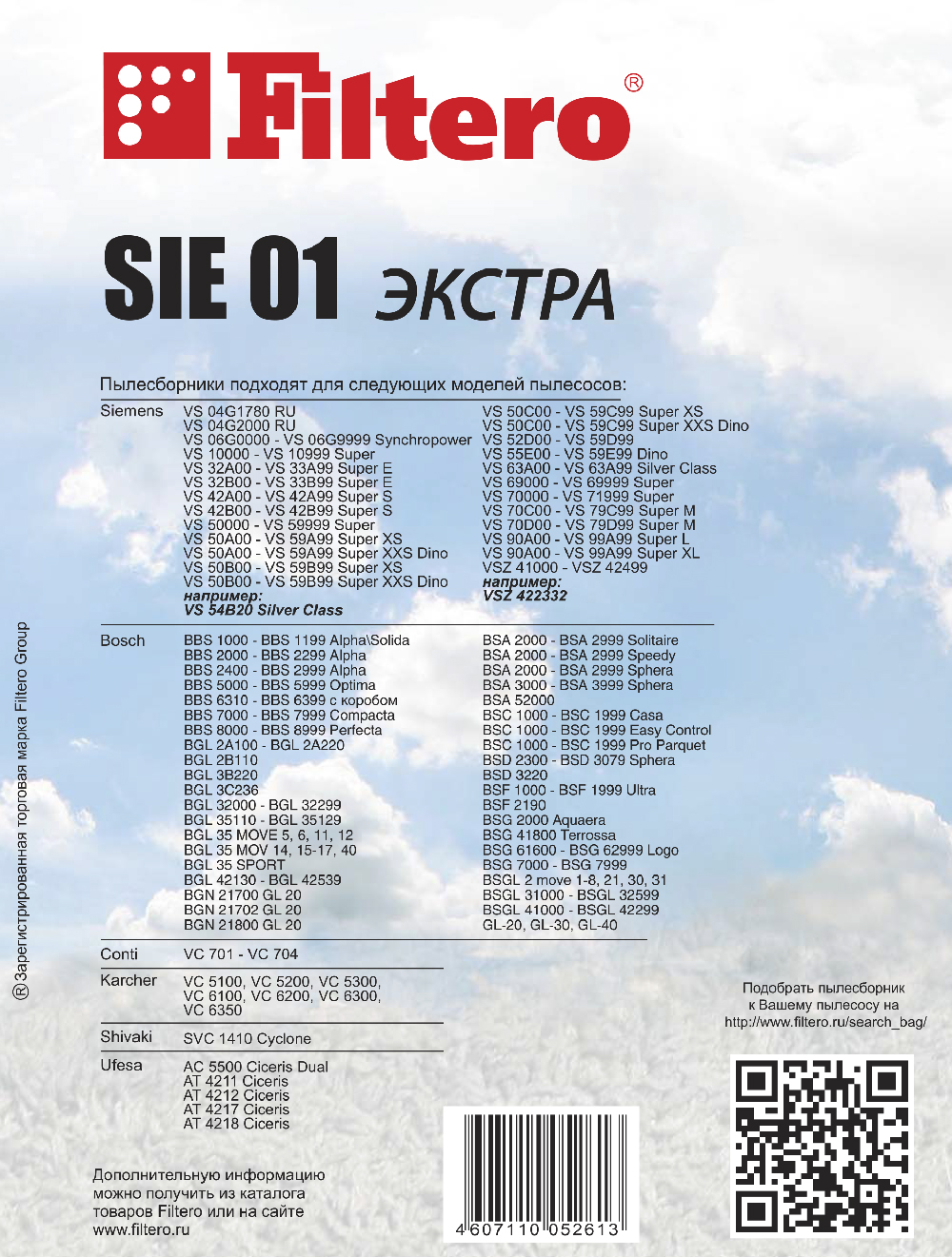 Мешки для пылесоса Filtero SIE 01 Экстра (4 шт) Bosch, Siemens, Karcher, Shivaki, Conti, Ufesa