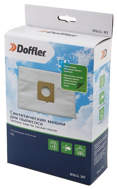 Пылесборник DOFFLER BSLG 30 отличается повышенной прочностью и устойчивостью к воздействию влаги. Изготовлен из плотного синтетического материала, что увеличивает срок службы. Задержка сухих частиц в мешке способствует качественному очищению поступающего воздушного потока и предотвращает их попадание на внутренние детали пылесоса. Клапан на мешке обеспечивает надежное крепление внутри специального отделения. Набор мешков предназначен для совместного использования с пылесосами LG. В наборе 5 шт.