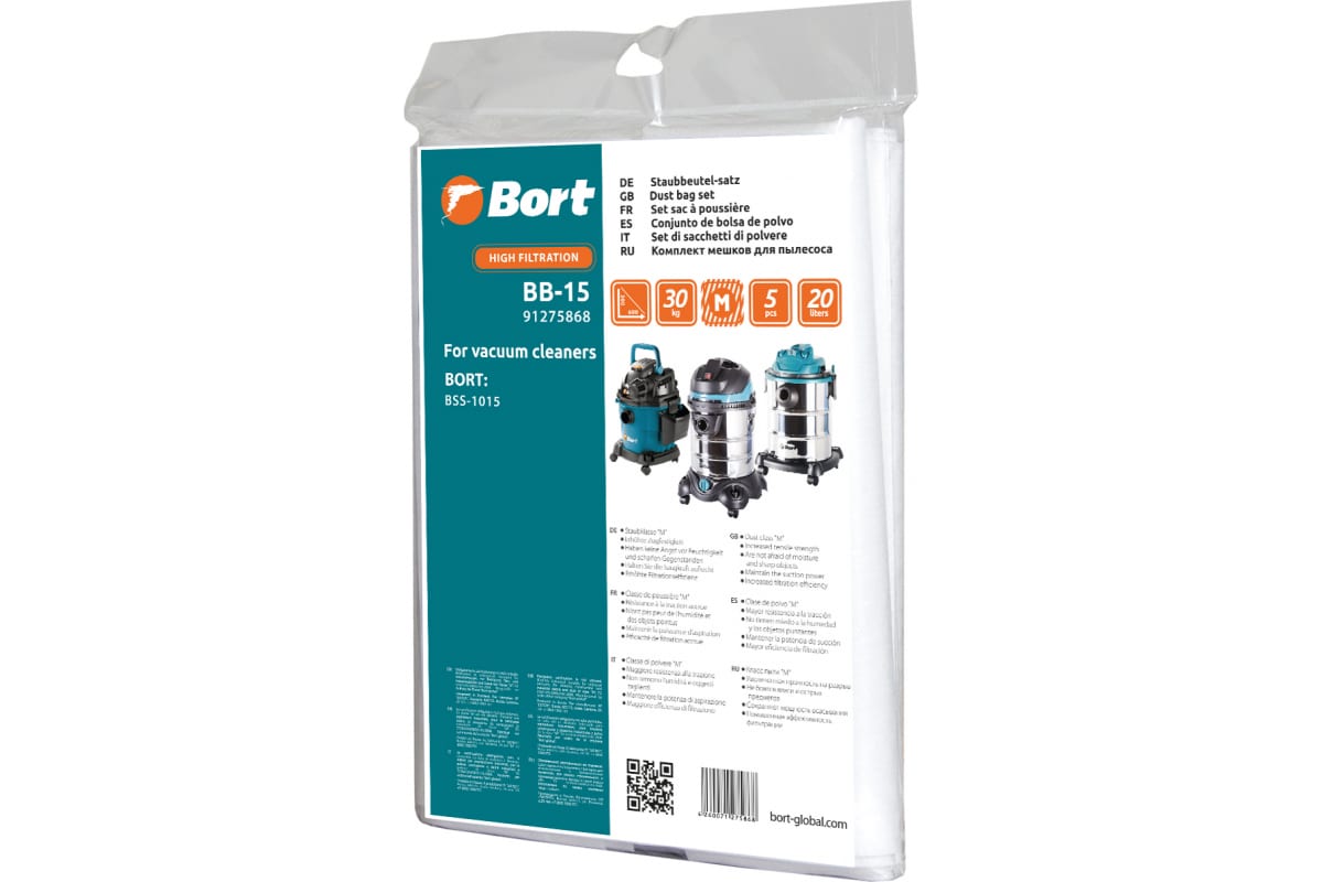 Комплект мешков пылесборных для пылесоса BB-15 BORT 91275868 состоит из прочных фильтр-мешков из многослойной синтетической ткани повышенной плотности. Позволяют собирать мельчайшие частицы пыли, влажный и строительный мусор. Класс фильтрации - М. Подходят к пылесосу BORT BSS-1015.