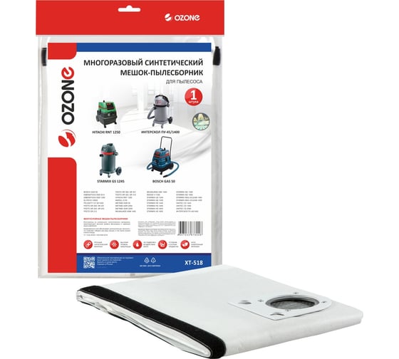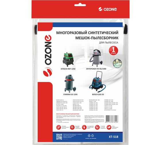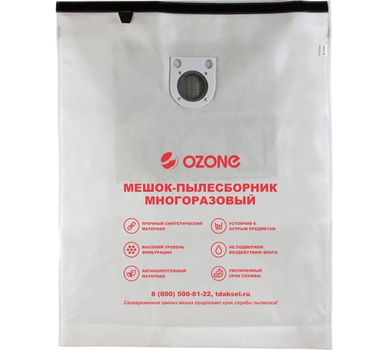 Мешок-пылесборник OZONE XT-518 произведен из пяти слоев фильтрующего материала и имеет дополнительную карбоновую защиту. Специальный клапан и застежка (липучка) обеспечивают удобство очистки мешка. Данный пылесборник сшивается и выдерживает нагрузку до 50 кг, не боится влаги и острых предметов. Многоразовый мешок можно стирать в стиральной машине, при этом его фильтрующие свойства не теряются. Пылесборник служит от 6 месяцев при интенсивной нагрузке.