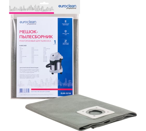 Оригинальный синтетический мешок-пылесборник EURO Clean EUR-5218 предназначен для промышленных и строительных пылесосов: KARCHER WD 3.200; KARCHER WD 3.300; KARCHER WD 3.500; KARCHER 6.959-130; KARCHER A 2204-2254 serie; KARCHER A 2504-2554 serie; KARCHER A 2604-2634 serie; KARCHER SE 4001; KARCHER SE 4002. Они вмещают до 12 литров мусора. Данные мешки очень прочные и подходят для многоразового использования.