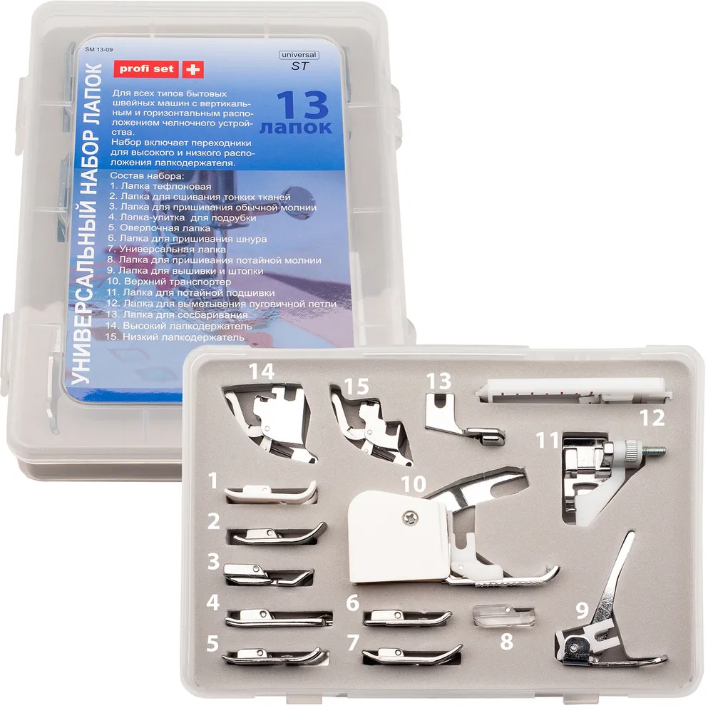Универсальный набор лапок Profi Set SM 13-09 для швейных машин любого типа. Универсальность достигается путем наличия в наборе собственных лапкодержателей, которые крепятся взамен "родного".