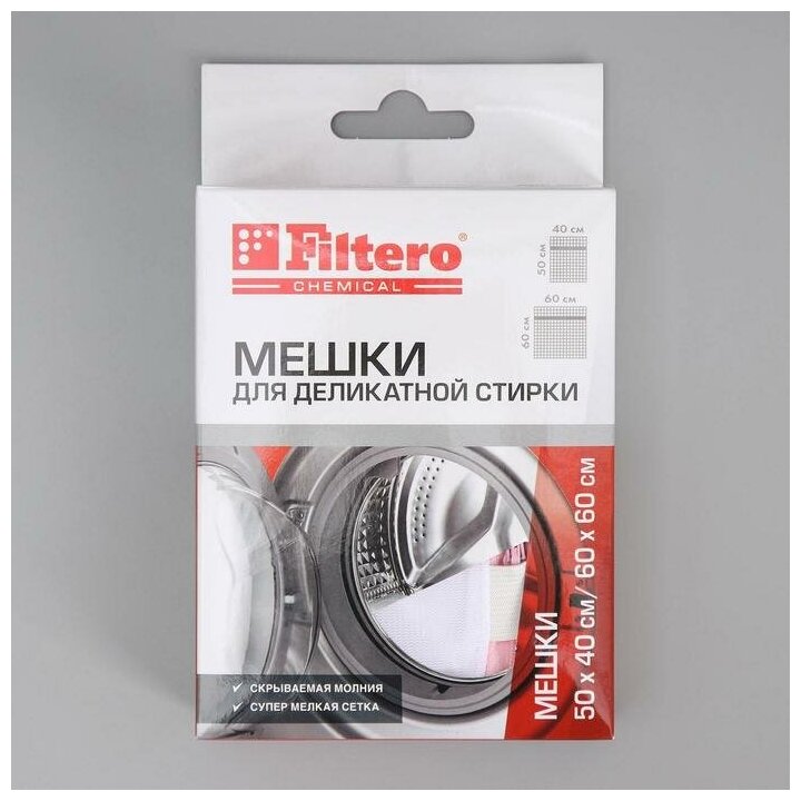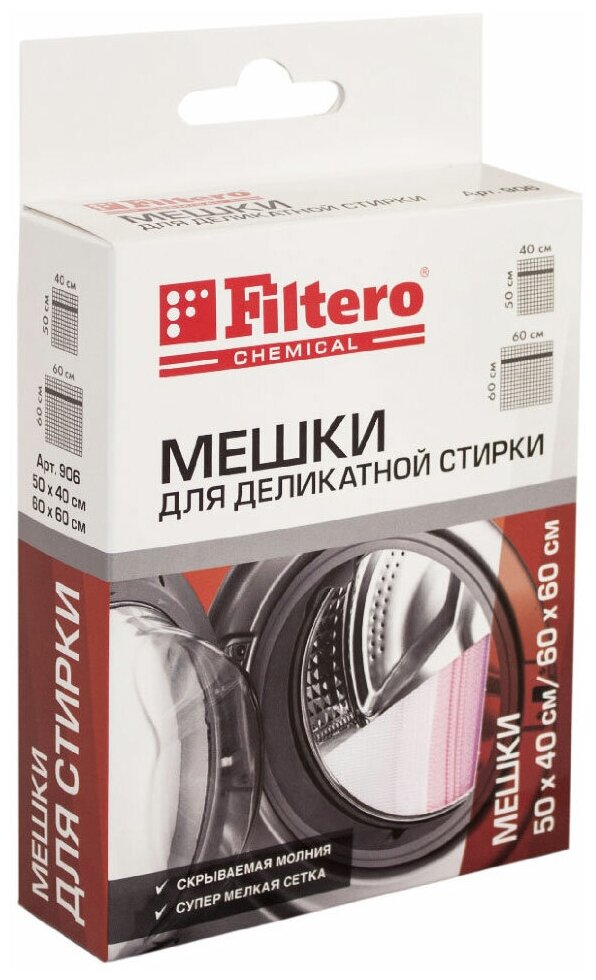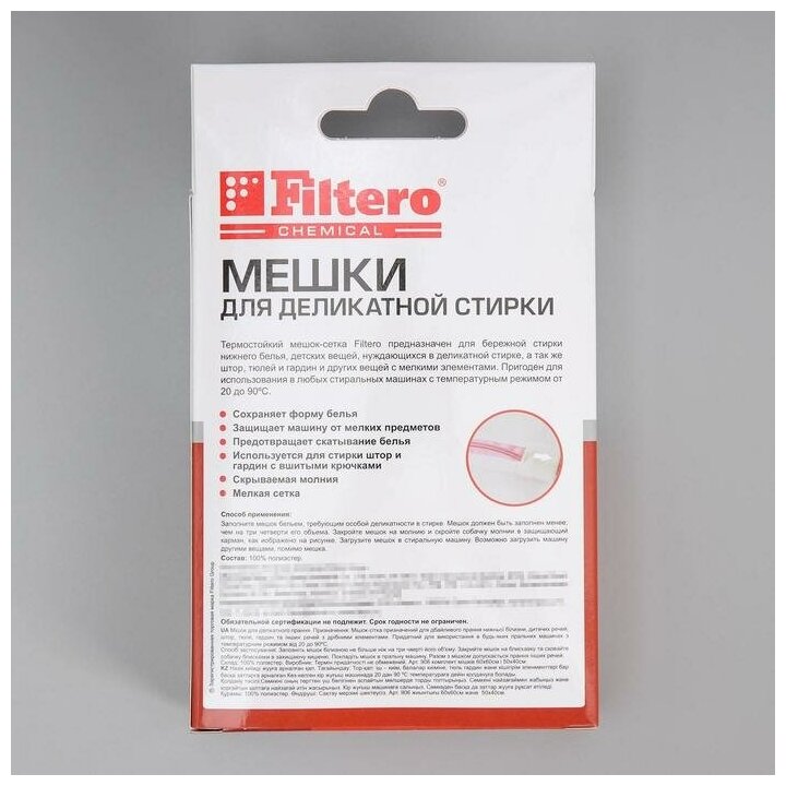 Термостойкий мешок-сетка Filteroпредназначен для бережной стирки нижнего белья, детских вещей, нуждающихся в деликатной стирке, а так же штор, тюлей и гардин и других вещей с мелкими элементами. Пригоден для использования в любых стиральных машинах с температурным режимом от 20 до 90ºС.