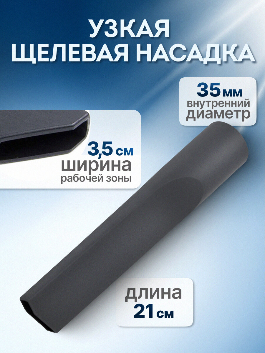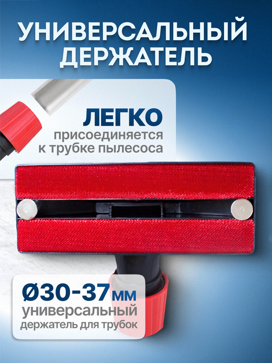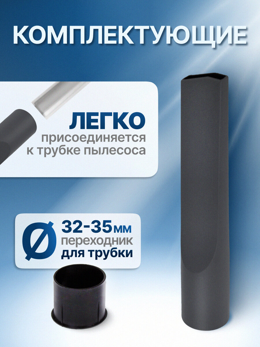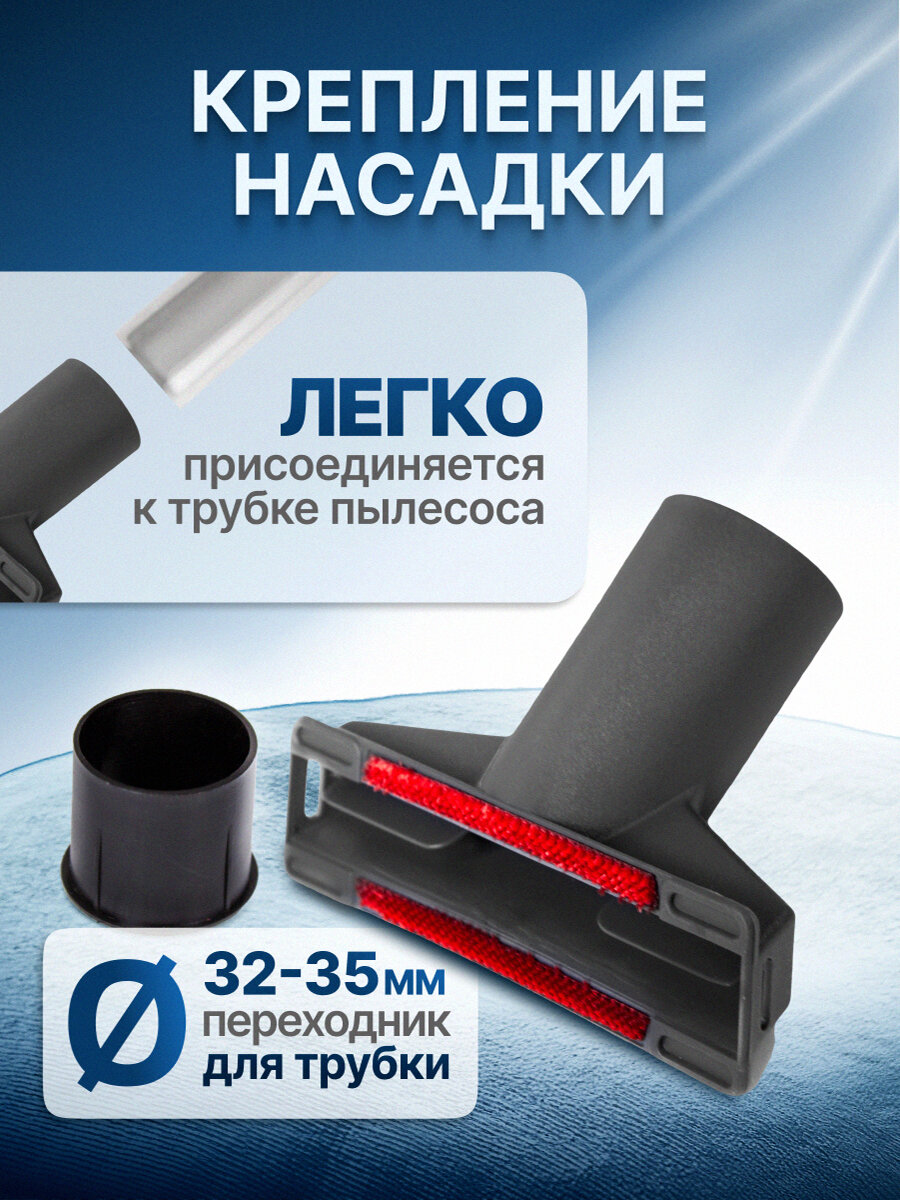 Наличие переходника позволяет использовать насадку с большинством пылесосов известных марок с диаметром удлинительной трубки 32 или 35 мм.