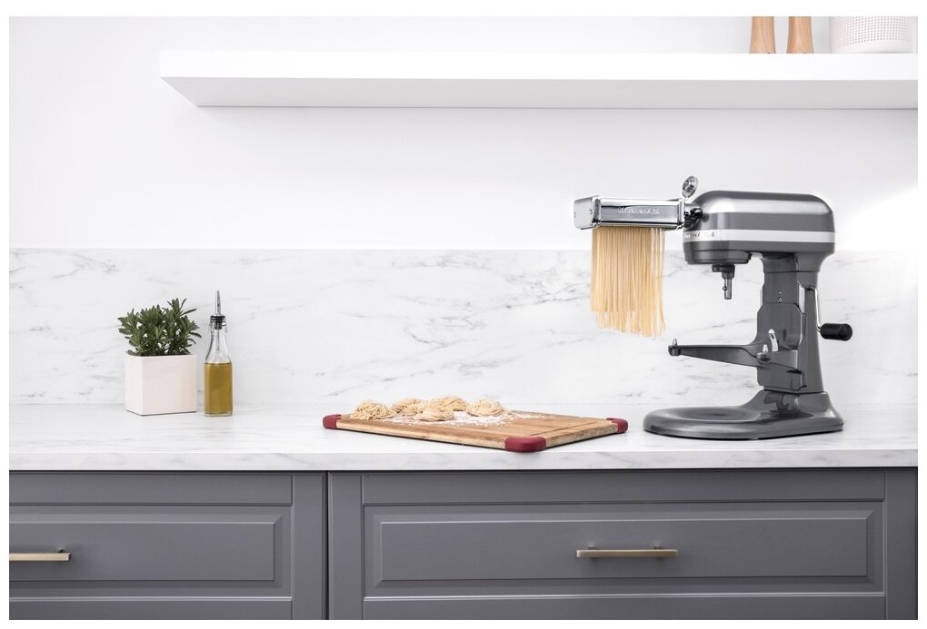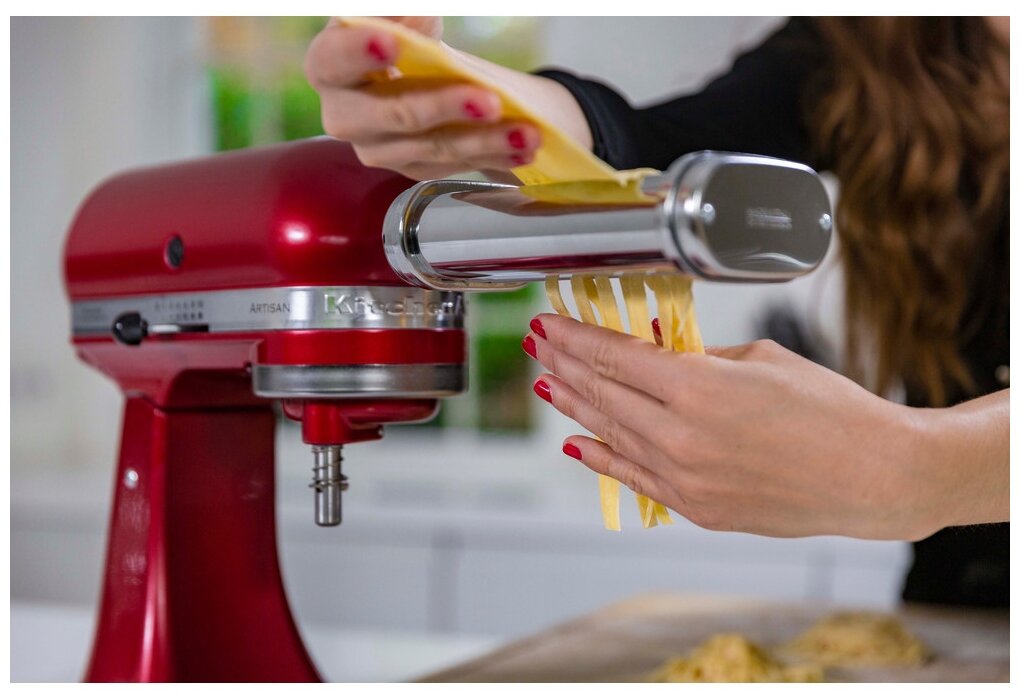 Пропуская тесто для пасты через валики, вы получите идеальные тонкие пласты. Эти пласты можно использовать не разрезая (например, для лазаньи), или, пропустив их через насадки для нарезки, получить фетучини и спагетти.
