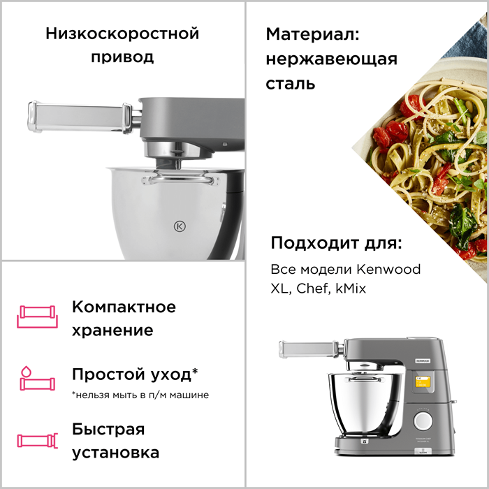 С насадкой для приготовления феттуччине KAX981ME Вы порадуете себя и своих близких аппетитной пастой из свежих и натуральных ингредиентов, дополняя ее вкус ароматными густыми соусами на Ваш выбор.