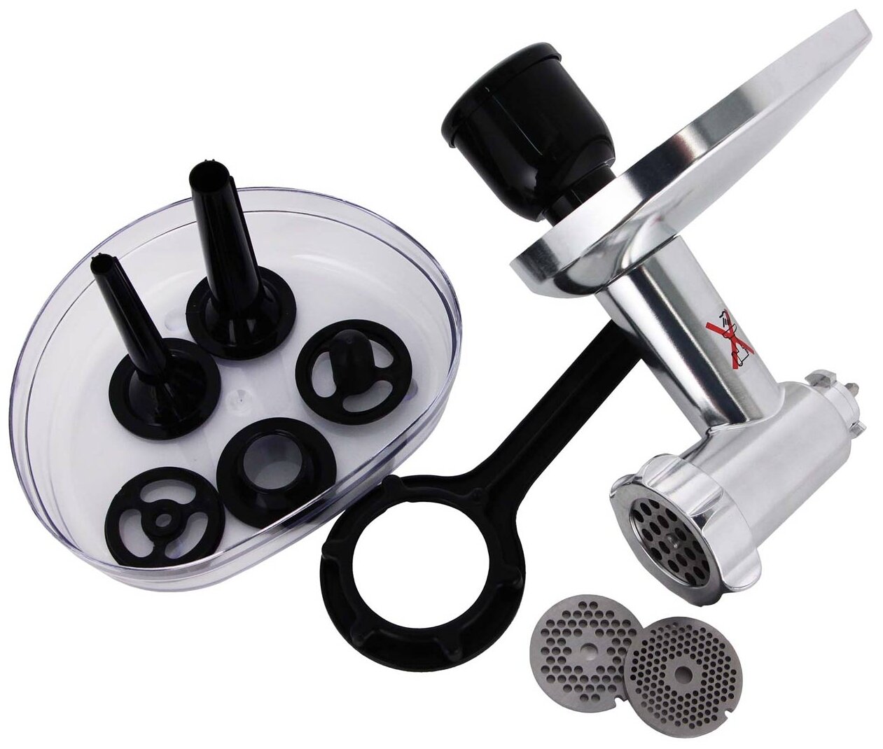 три решетки для мелкого (3 мм), среднего (4.5 мм) и крупного (8 мм) помола, дополнительные насадки для приготовления домашних колбас и кеббе