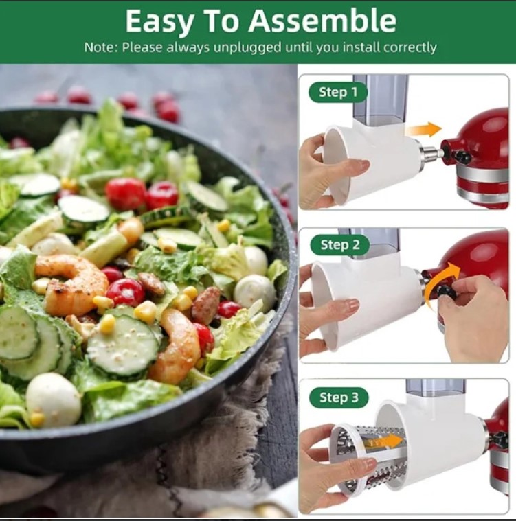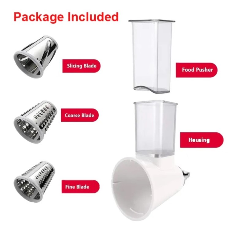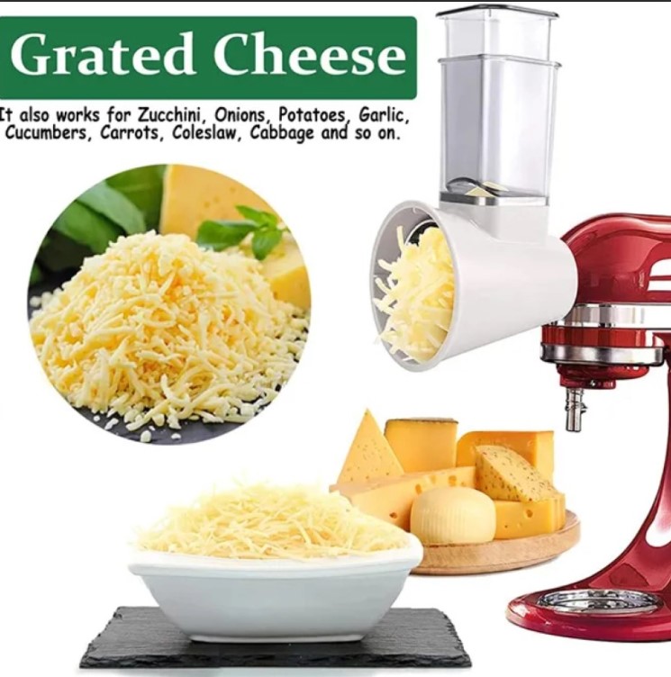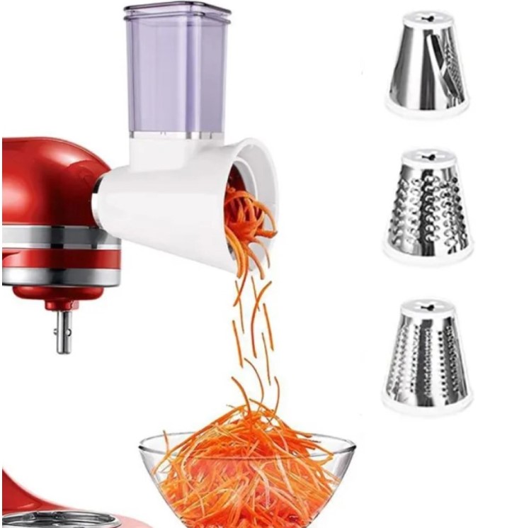 Насадка-овощерезка KitchenAid (АНАЛОГ) - эта насадка чрезвычайно полезна и используется намного чаще других насадок в большинстве рецептов. В комплект овощерезки входят три стандартных насадки для средней, крупной и мелкой резки. Все три варианта превосходно подходят для приготовления салатов, резки картофеля, измельчения фруктов и сыра. Если в середине рецепта вам потребуется переключить режим с резки на шинковку, вам не придется снимать всю насадку с миксера, необходимо только заменить соответствующий нож и продолжать измельчение в ту же чашу.