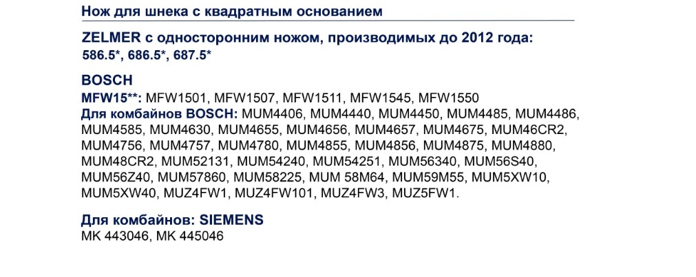 ZELMER (НОЖ ОДНОСТОРОННИЙ для моделей мясорубок Zelmer, произведенных до 2012 года): 586.5*, 686.5*, 687.5* BOSCH: MFW15..: MFW1501, MFW1507, MFW1511, MFW1545, MFW1550 BOSCH: MUM5XW10, MUM5XW40, MUM59M55, MUM 58M64, MUM58225/0*, MUM57860/0*, MUM56340/0*, MUM56S40/0*, MUM56Z40/0*, MUM54251/0*, MUM54240/0*, MUM52131/0*, MUM48CR2/0*, MUM4880/0*, MUM4875/0*, MUM4856EU/0*, MUM4855/0*, MUM4756/0*, MUM4757/0*, MUM4780/0*, MUM46CR2/0*, MUM4675EU/0*, MUM4657/0*, MUM4656/0*, MUM4655/0*, MUM4585/0*, MUM4555/0*, MUM4486/0*, MUM4485/0*, MUM4450/0*, MUM4440/0*, MUM4406/0*, MUZ5FW1, MUZ4FW1, MUZ4FW3, MUZ4FW101SIEMENS: MK443046, MK445046