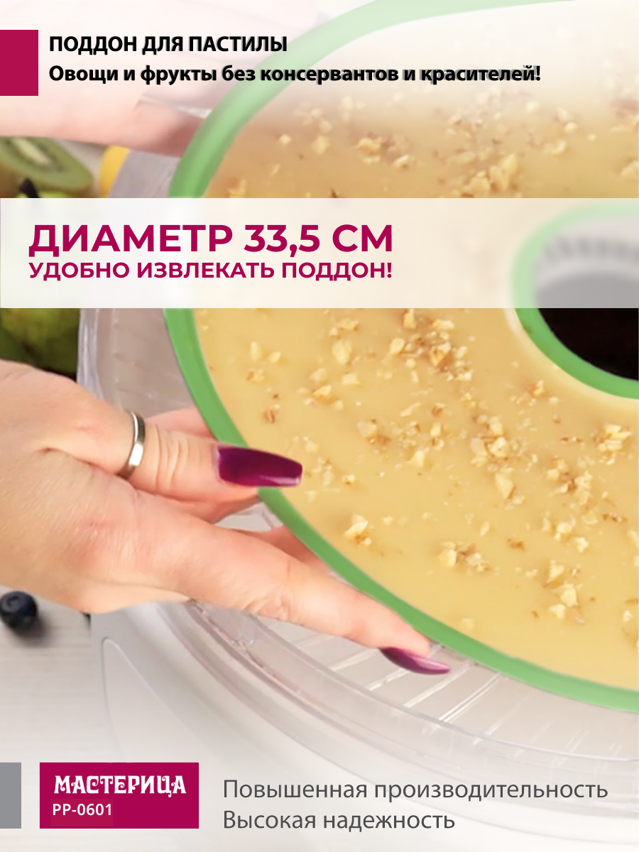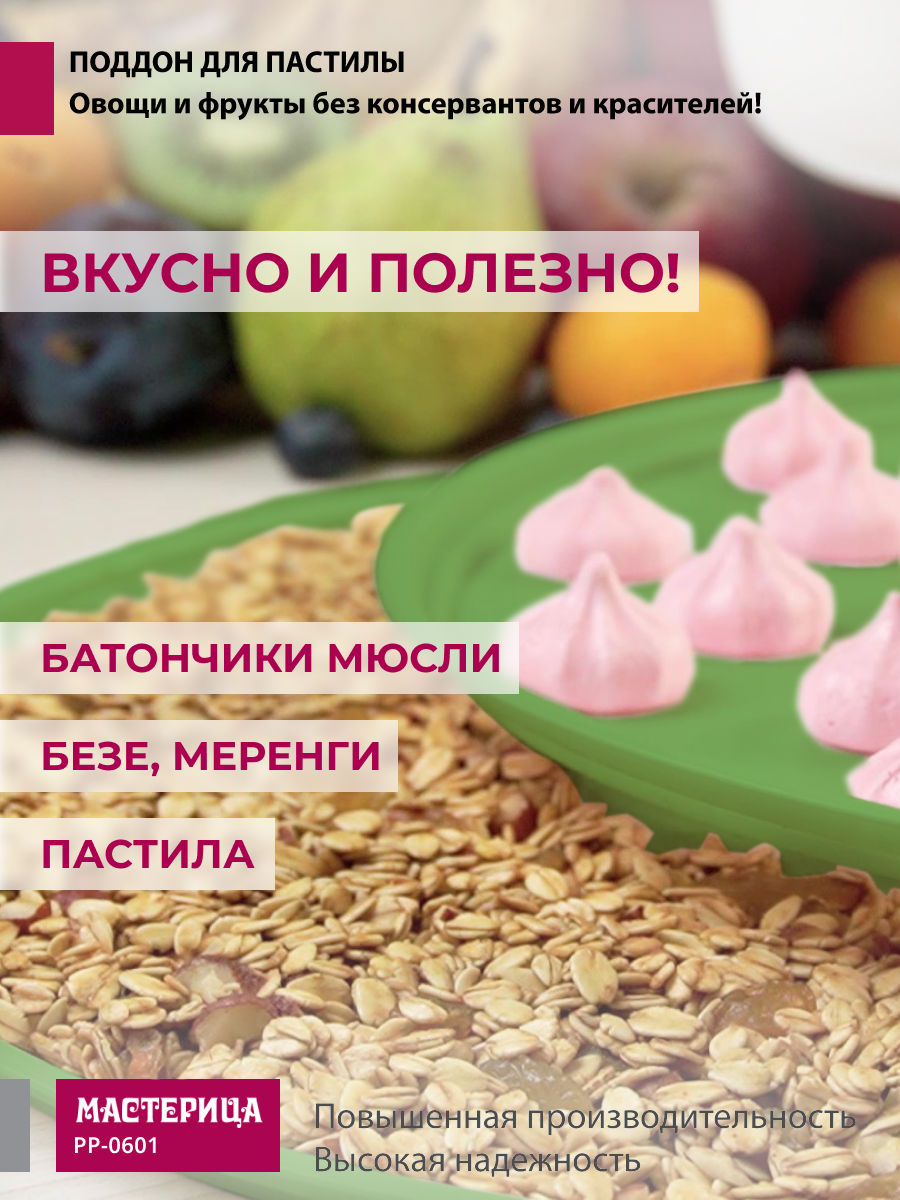 Поддоны Мастерица - незаменимый аксессуар для сушки вашего любимого лакомства. Поддоны для пастилы предназначены специально для использования в сушилках и обеспечивают надежную поддержку пастилы в процессе сушки. Поддоны позволят вам создать вкусные и полезные деликатесы, такие как пастила, безе, меренги, батончики, мюсли.