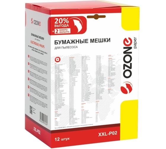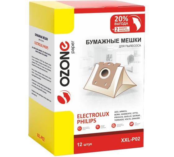 Мешки-пылесборники Ozone P02 предназначены для пылесоса ELECTROLUX, также подойдут для пылесосов брендов: AEG, BORK, PHILIPS, TORNADO, VOLTA, ZANUSSI.