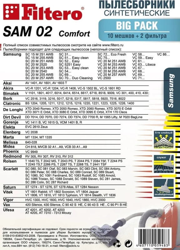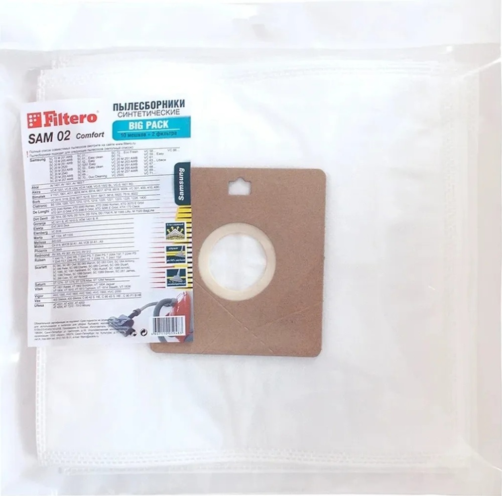 Мешки-пылесборники Filtero SAM 02 Comfort, Big Pack 10штук произведены из 5-ти слойного синтетического микроволокна, поэтому в отличие от бумажных мешков, Filtero Comfort не рвутся, не боятся острых предметов и влаги, собирают больше пыли (до 50%). Обеспечивают уровень очистки воздуха 99%, что выше, чем у бумажных пылесборников, при этом сохраняя высокую мощность всасывания пылесоса в течение всего периода службы пылесборника.