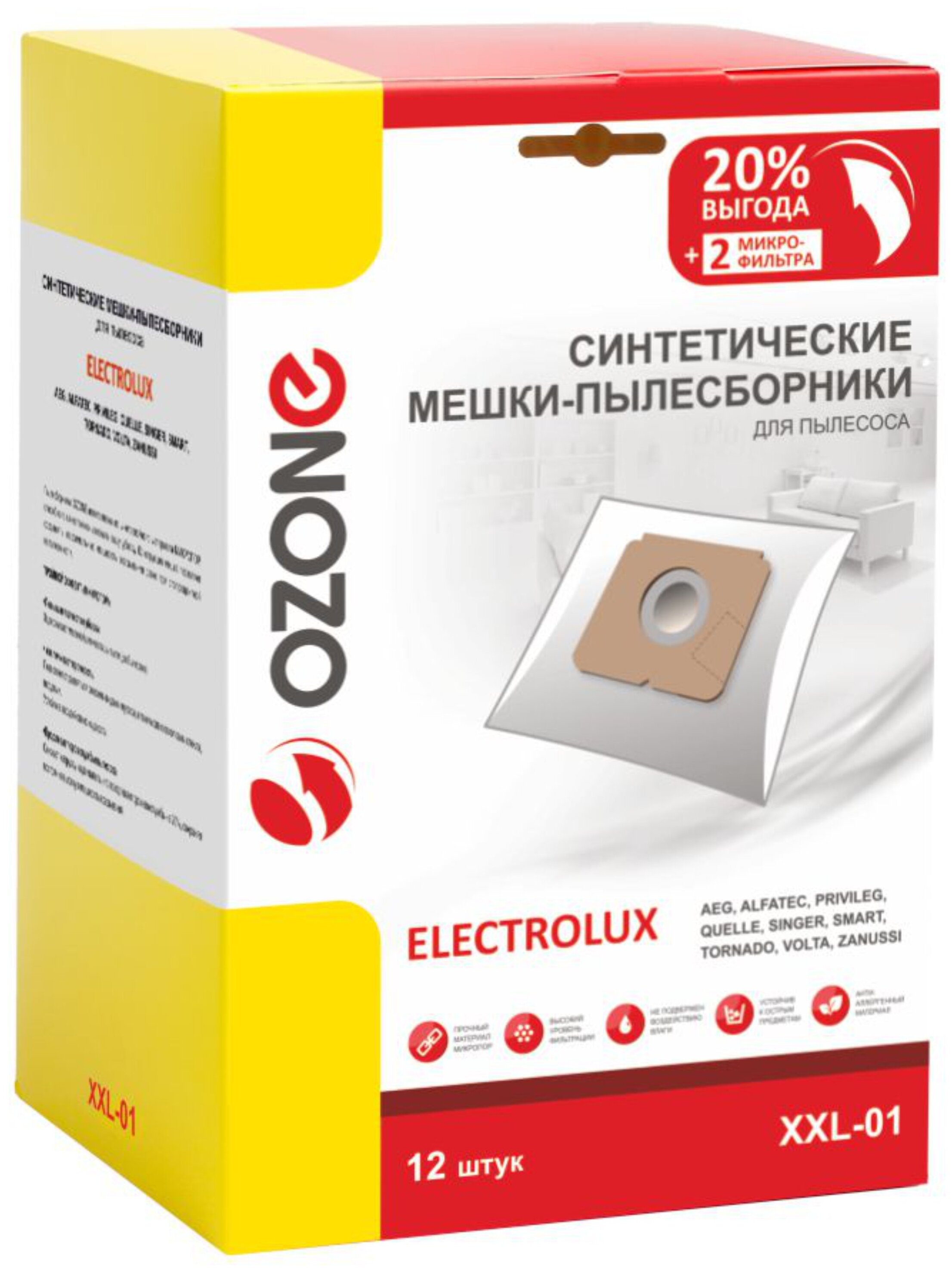 подходят: ELECTROLUX, TORNADO, VOLTA, ZANUSSI, бренд: OZONE, арт. XXL-01, тип оригинального мешка: E51, XIO Совместимость: AEG: SMART 100 – 199, VAMPYRINO ECOTEC, VAMPYRINO RX ELECTRONIC, VAMPYRINO SPACE 1, ТИП GR 5S, VAMPYRINO SX 7, VAMPYRINO LX, VAMPYRINO EC 1, SMART 140.0, VAMPYRINO RX, VAMPYRINO LX ELECTRONIC ECOTEC, VAMPYRINO EXQUISIT, AE3450 INGENIO, VAMPYRINO CE 1, VAMPYRINO 140, VAMPYRINO 100 - 199, VAMPYRINO SX 5, VAMPYRINO E, VAMPYRINO 150, VAMPYRINO SPACE, SMART 170.0, AE3460 INGENIO, VAMPYRINO CAR & CLEAN, VAMPYRINO SX, VAMPYRINO SX 1, VAMPYRINO LX 1, VAMPYRINO SX 3, VAMPYRINO COLORE, VAMPYRINO EC, ТИП GR 5, AE3465 INGENIO, VAMPYRINO S, VAMPYRINO S ELECTRONIC, VAMPYRINO SX ELECTRONIC, VAMPYRINO COLORE 3, VAMPYRINO COLORE 5, SMART 160.0, VAMPYRINO LX ELECTRONIC, VAMPYRINO RX ELECTRONIC OKO, VAMPYRINO OKO, AE3455 INGENIO, VAMPYRINO E ELECTRONIC, VAMPYRINO ECOTEC 920, VAMPYRINO 90, VAMPYRINO EC ELECTRONIC ALFATEC: ALFA JET A 3715, ALFO 400 E, ALFO 300 E, A 2265 ELECTROLUX: Z1018 XIO, Z1570 INGENIO, Z1011 XIO, Z2312 MONDO PLUS, Z1013 XIO, Z1037 XIO, Z1000 - Z1099 XIO, Z1027 XIO, BOSS PLUS, Z1035 XIO, Z1017 XIO, Z1032 XIO, Z2310 MONDO PLUS, Z1028 XIO, Z1020 XIO, Z1038 XIO, ZCE2400, Z2306 MONDO PLUS, Z1029 XIO, Z1031 XIO, Z1030 XIO, Z1036 XIO, Z1021 XIO, U2100 - U2170 MEGA BOSS, Z1010 XIO, ZCE2410, ZCE1800, Z1015 XIO, Z1025 XIO, Z1014 XIO, Z2315 MONDO PLUS, Z1560 INGENIO, ZCE2445, Z1033 XIO, Z2305 MONDO PLUS, XIO, ZCE2200, Z1026 XIO, Z1009 XIO, Z1034 XIO PRIVILEG: 195.159, 635.420, 106.570, 104.462, 372.518, 911.758, 552.053, 106.552, 102.793, 106.462, 662.035 QUELLE: 195.159, 662.035, 635.420, 104.462, 106.462, 102.793, 106.570, 552.053, 911.758, 372.518, 106.552 SINGER: TORCE 10, FORCE 10, TONIC LINE SMART: 160.0, 170.0, 140.0 TORNADO: TO6152 CAMELEON BUTTERFLY, TO6180 CAMELEON, TO6180 CAMELEON BUTTERFLY, TO6190 CAMELEON BUTTERFLY, CAMELEON ELECTRONIC, TO6170 CAMELEON BUTTERFLY, ONYX 125, TO6160 CAMELEON BUTTERFLY, TO6165 CAMELEON, TO6155 CAMELEON BUTTERFLY, TO6164 CAMELEON BUTTERFLY, TO6160 CAMELEON, TO6163 CAMELEON BUTTERFLY, TO6170 CAMELEON, TO6162 CAMELEON BUTTERFLY, TO6190 CAMELEON, TO6150 CAMELEON, TO6142 CAMELEON BUTTERFLY VOLTA: U2330, U1138 ROLFY, U3705 SPRITE, U1022 ROLFY, U2320, U1142 ROLFY, U4700 CAMPUS, U1021 ROLFY, U1000 - U1009 MICRO, U3702 POWERLITE, U1039 ROLFY, U1010 - U1035 ROLFY, U1011 ROLFY, U4502 GEMINI SERIES II, U4503 PULSAR, U1018 ROLFY, U1150 ROLFY, V34, U3410 - U3450 XIO, U1030 ROLFY, U1015 ROLFY, U1036 ROLFY, U1013 ROLFY, U1020 ROLFY, U1134 ROLFY, U1014 ROLFY, U3701 POWERLITE, U3440 XIO, U1135 ROLFY, U1019 ROLFY, U1029 ROLFY, U1004 ROLFY ZANUSSI: ZAN3712