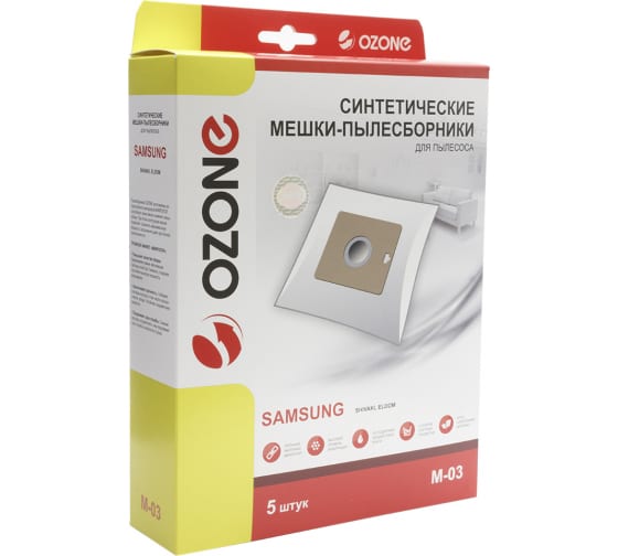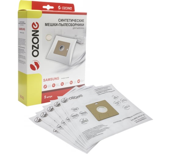 Мешки-пылесборники синтетические (5 шт; с микрофильтром) для Samsung OZONE M-03 используются с бытовыми пылесосами Samsung. Обладают высокими фильтрационными свойствами и могут удержать даже мельчайшие частицы пыли. Нетканый синетический материал, из которого изготовлены пылесборники, гарантирует высокую прочность и способность выдержать до 30 кг нагрузки. Заполняемость мешка - 100%. Одноразовые.
