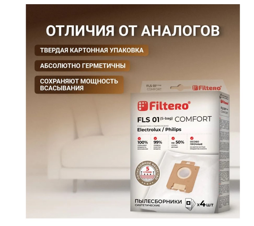 В отличие от бумажных мешков, Filtero Comfort не рвутся, не боятся острых предметов и влаги, собирают больше пыли (до 50%). Filtero Comfort обеспечивают уровень очистки воздуха 99%, что выше, чем у бумажных пылесборников, при этом сохраняя высокую мощность всасывания пылесоса в течение всего периода службы пылесборника.