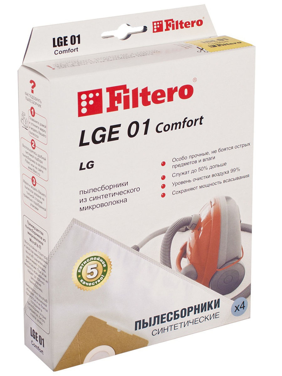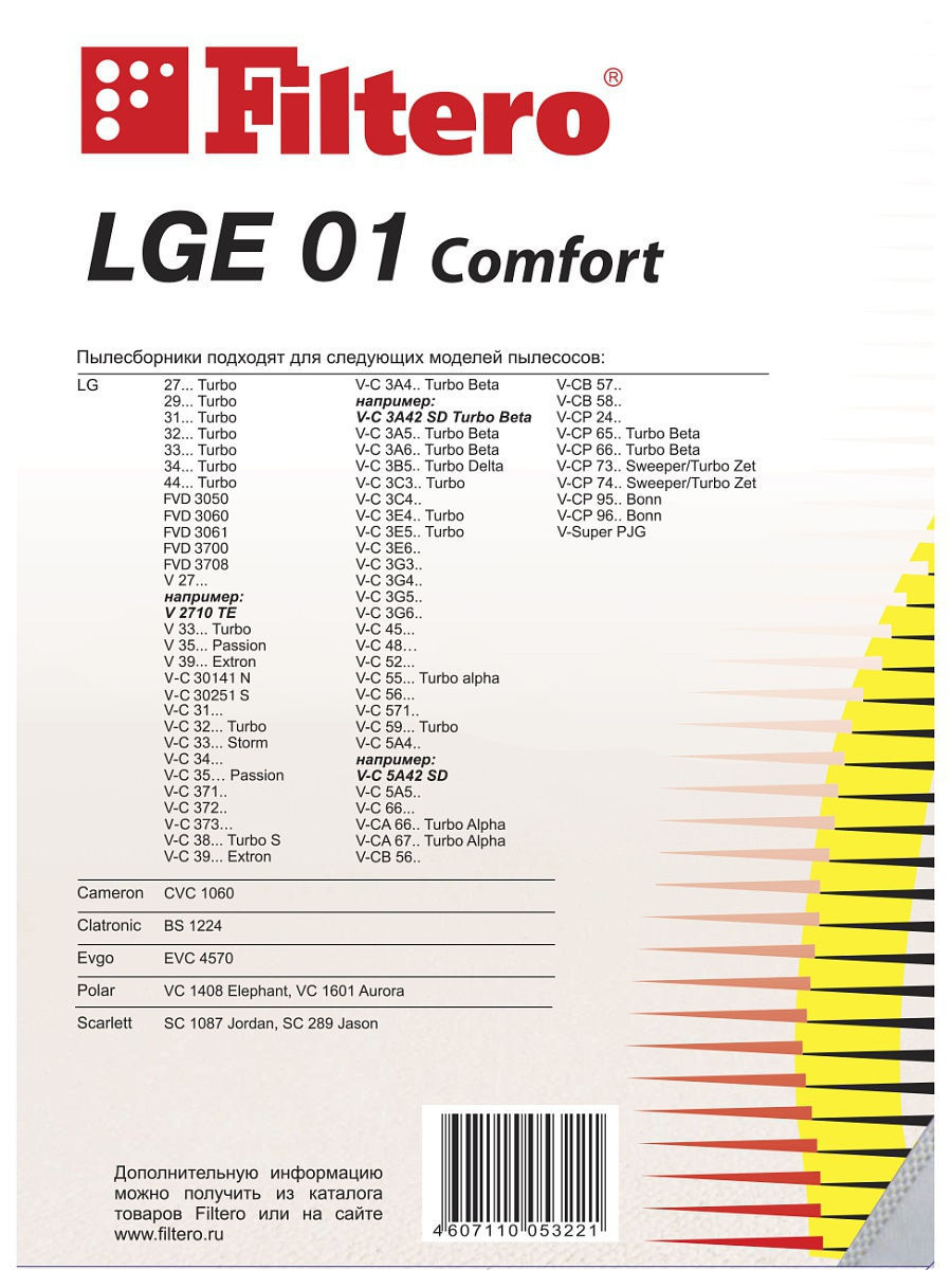 Пылесборники Filtero LGE 01 Comfort подходят для следующих торговых марок пылесосов: LG, CAMERON, CLATRONIC, EVGO, POLAR , SCARLETT