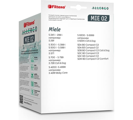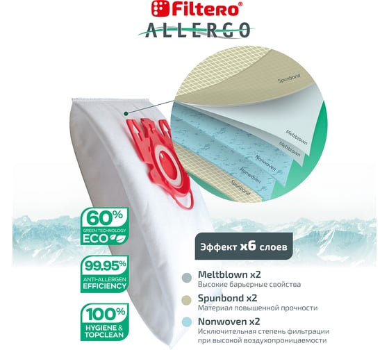 ALLERGO значительно эффективнее обычных мешков - в них еще больше слоев для исключительной фильтрации. Разработанный Filtero шестислойный синтетический материал MicroFib Plus® задерживает до 99,95% самой мелкой пыли, включая аллергены, обеспечивает высочайшее качество очистки воздуха, защищая от аллергии.