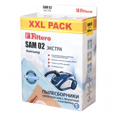 Мешки-пылесборники Filtero SAM 02 ЭКСТРА Anti-Allergen, 8 штук. Пылесборники Filtero ЭКСТРА Anti-Allergen произведены из синтетического микроволокна MicroFib с антибактериальной пропиткой Anti-Bac. Очень прочные, они не боятся острых предметов и влаги, собирают больше пыли (до 50%) и обеспечивают уровень очистки воздуха 99,9%, а также задерживают бактерии и препятствуют их распространению. При этом мощность всасывания пылесоса сохраняется в течение всего периода службы пылесборника.