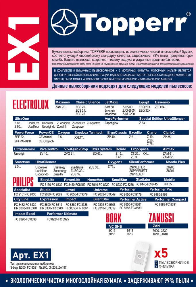 Описание: Бумажные пылесборники EX 1 для пылесосов AEG, BORK, ELECTROLUX, PHILIPS, ZANUSSI изготовлены из экологически чистой двухслойной бумаги, соответствующей европейскому стандарту качества, задерживают 99% пыли, продлевая срок службы пылесоса, сохраняют чистоту воздуха и устраняют вредные бактерии.