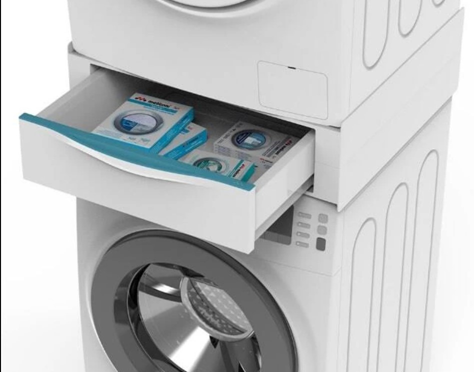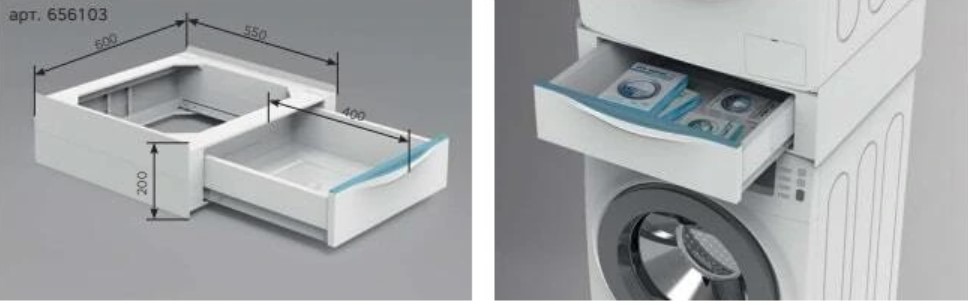 Усиленная сверхпрочная рама из технополимера с просторным выдвижным ящиком, нагрузка на ящик 10кг. 6-метровый ремень-стяжка с металлической застежкой защищает от разбалтывания креплений при отжиме. Резиновые прокладки снижают вибрацию и шум.