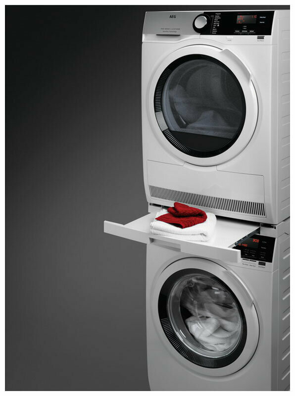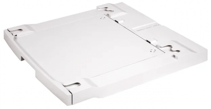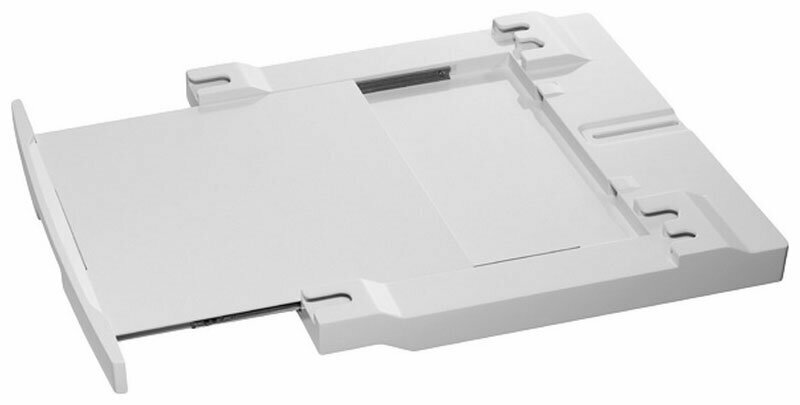 Соединительный элемент SKP11GW3 поможет расположить сушильную машину над стиральной. В комплект поставки входят все крепёжные элементы и нужный инструмент. Выдвижная полка, на которой можно будет удобно разместить корзину для высушенного белья.