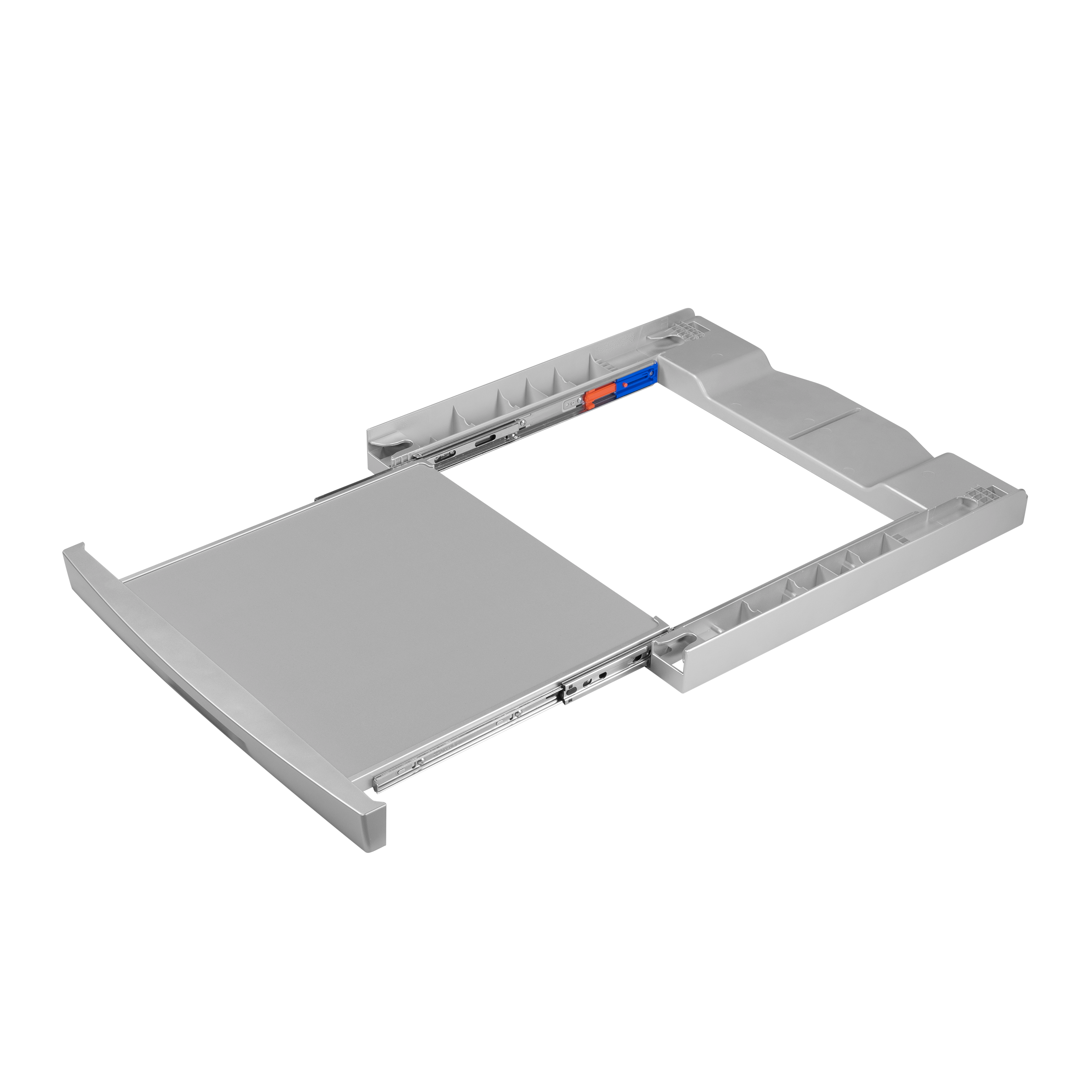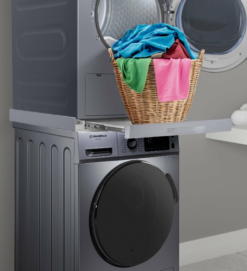 Благодаря выдвижной полке с автоматическими доводчиками больше не придется постоянно наклоняться к корзине с бельем или держать ее на весу при разгрузке сушильной машины, достаточно просто поставить корзину на полку.