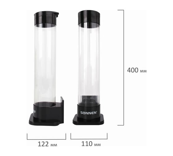 Емкость для стаканчиков изготовлена из прозрачного пластика, что позволяет видеть их количество.
