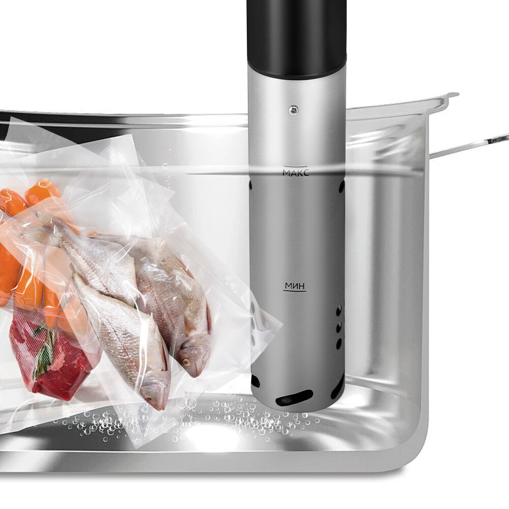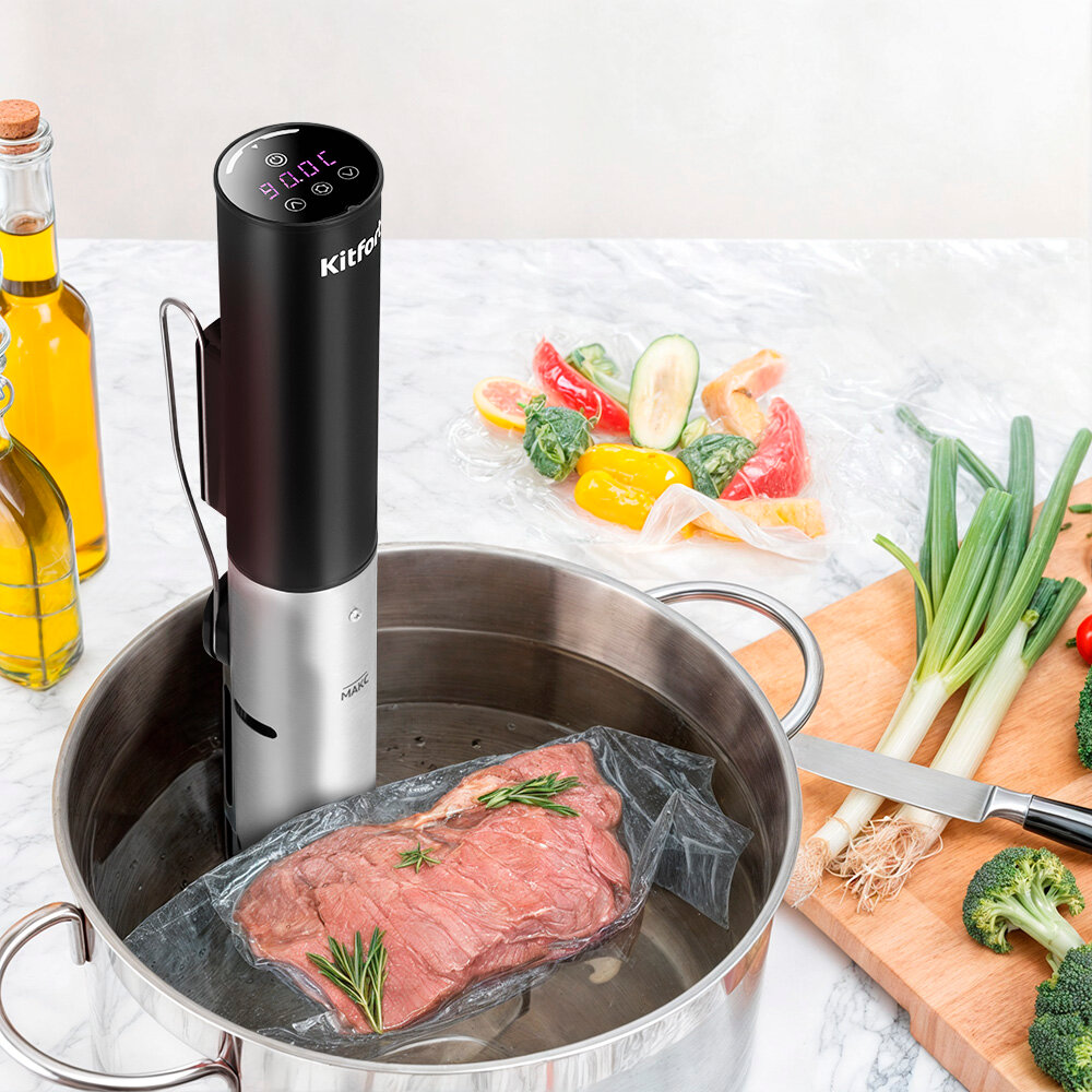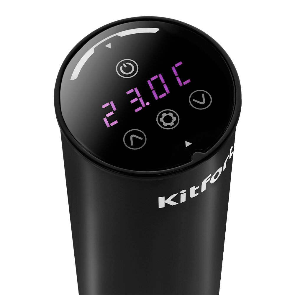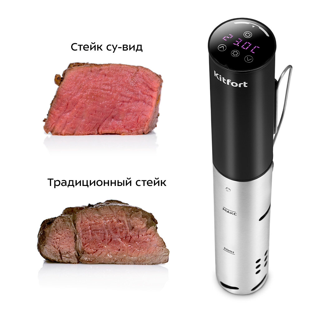 Погружной су-вид КТ-6416 предназначен для приготовления пищи в вакуумных герметичных пакетах, помещённых в чашу с водой. Sous Vide – французский термин, означающий «под вакуумом». Еда медленно готовится в течение долгого времени при низкой температуре.