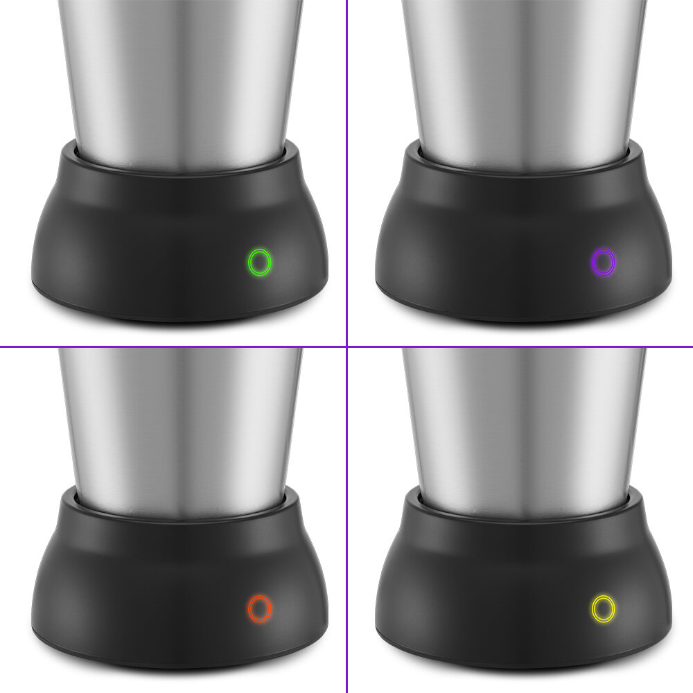 У кнопки есть световая индикация, указывающая на выбранный режим работы. Зелёный - молочная пенка с подогревом, фиолетовый - кофе по-турецки, красный - горячее молоко, жёлтый - какао. Режимы переключаются циклически.