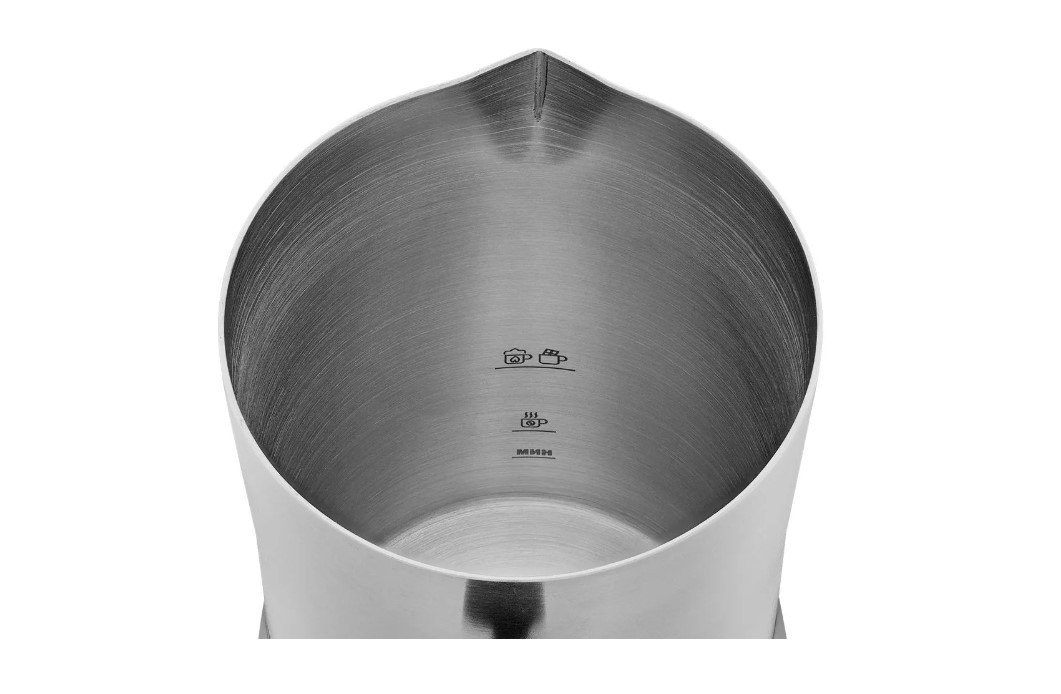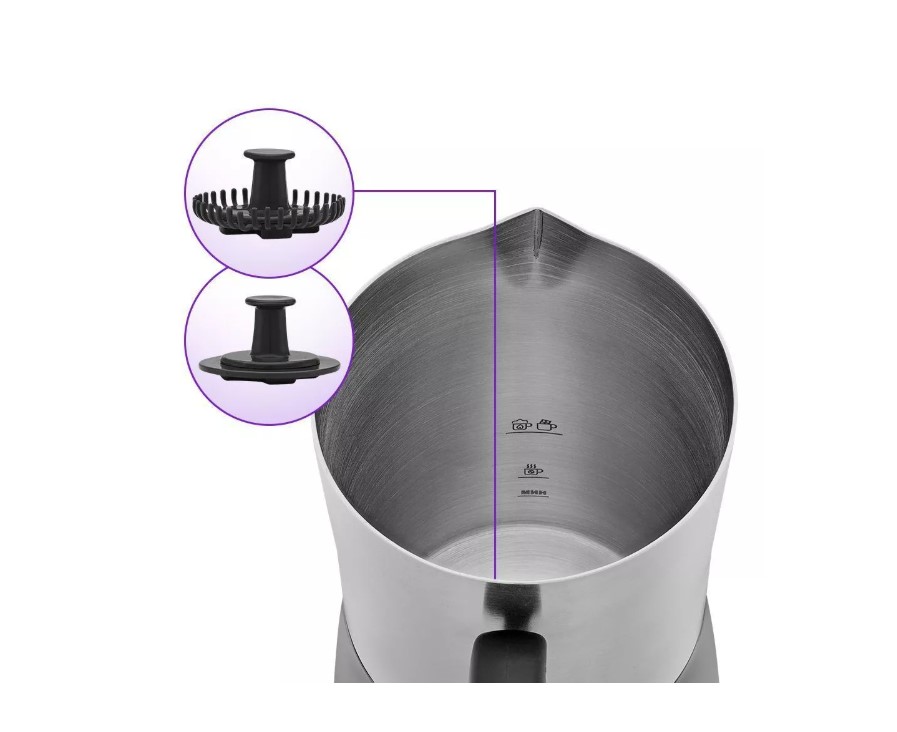 Корпус устройства произведён из нержавеющей стали. Насадка для смешивания используется для перемешивания молока во время его подогрева, насадка для вспенивания - для получения молочной пенки. Сам питчер имеет антипригарное покрытие