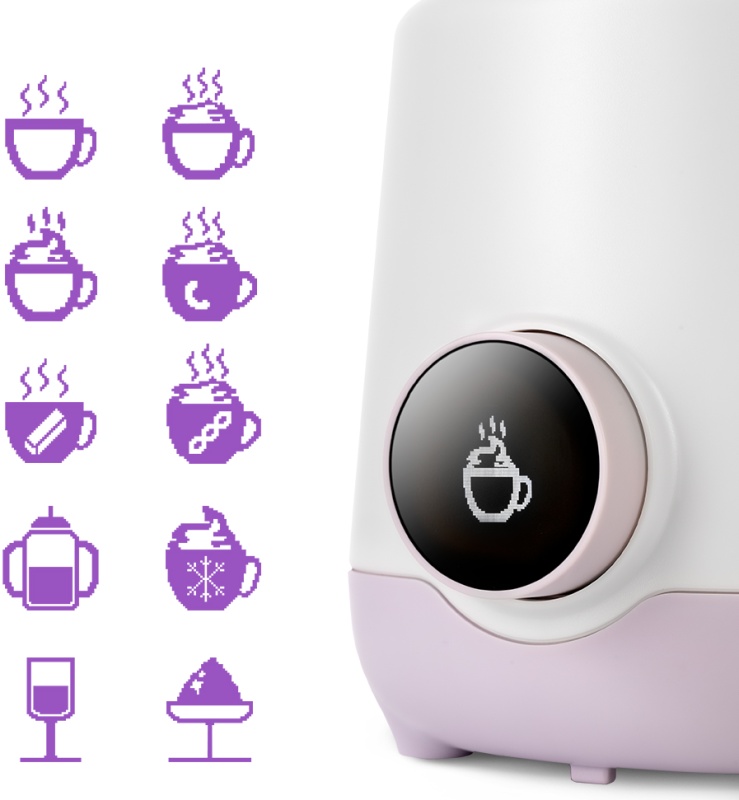 Поворот регулятора переключает следующие режимы работы: плотная или воздушная пенка с подогревом, смешивание, горячий шоколад, вспенивание без подогрева, вспенивание соевого молока, фраппе, глинтвейн, подогрев молока для детского питания.