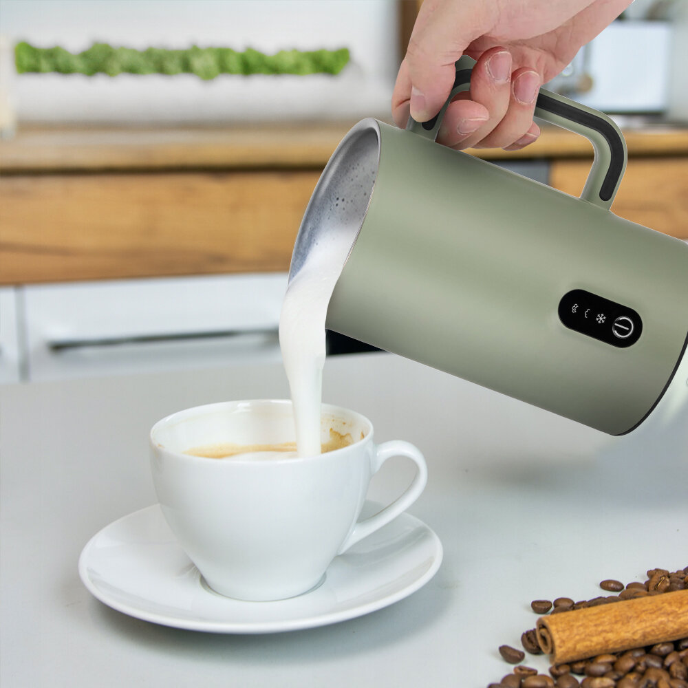 Прибор работает в трёх режимах: плотная пенка с нагревом, воздушная пенка с нагревом и вспенивание без нагрева. Корпус имеет двойные стенки и почти не нагревается во время работы. Ручка капучинатора пластиковая и удобно лежит в руке.