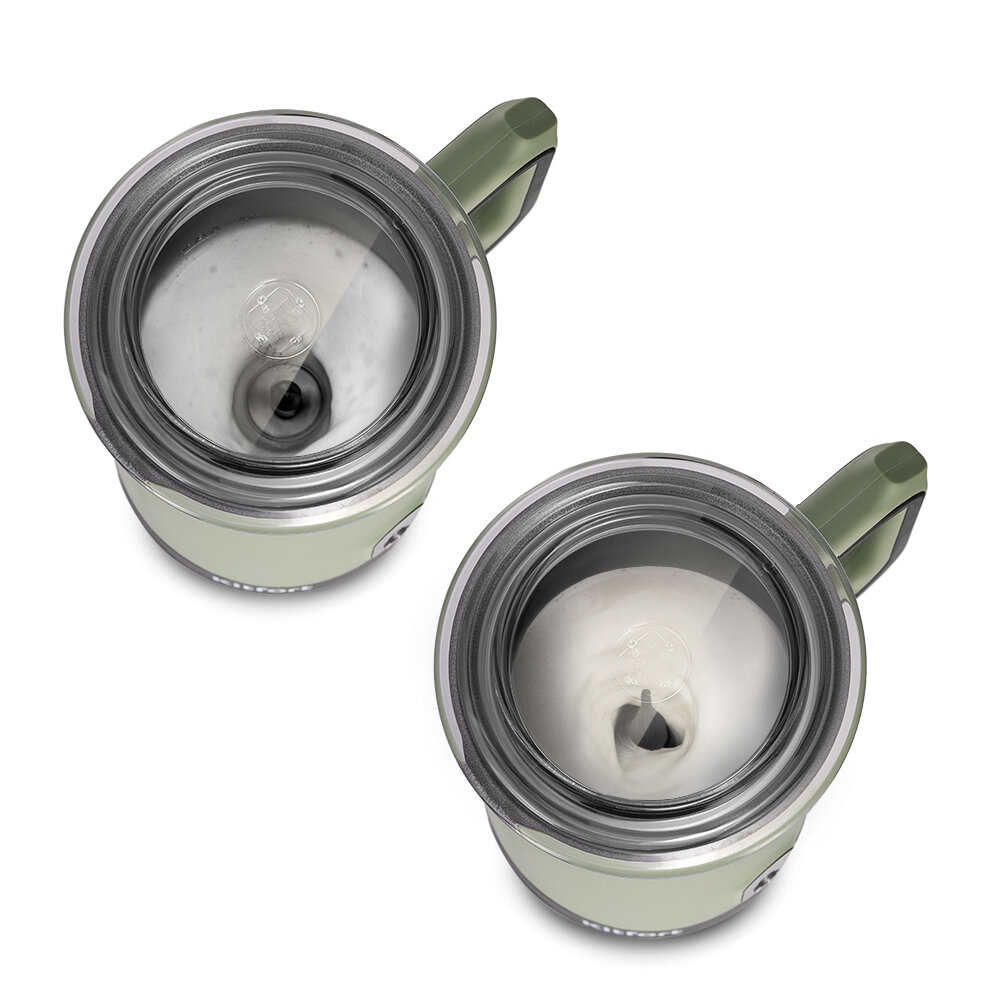 В комплекте 2 насадки: для вспенивания и смешивания. Через прозрачную крышку можно наблюдать за приготовлением. КТ-7272 — для тех, кто не хочет самостоятельно вспенивать молоко. Достаточно наполнить прибор нужным количеством молока и нажать на кнопку.