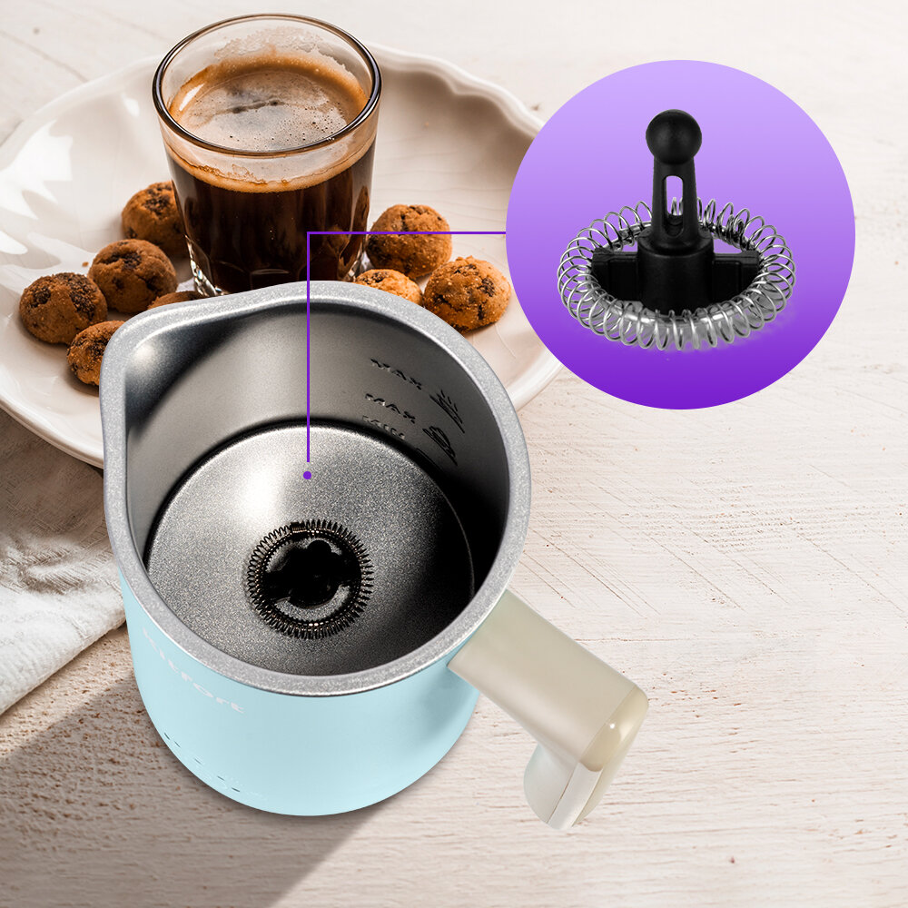 Насадка используется для получения молочной пенки, а также для перемешивания молока во время его подогрева. Без перемешивания молоко может подгореть. Для вашего удобства на внутренней стенке устройства сделаны отметки для заполнения молоком.