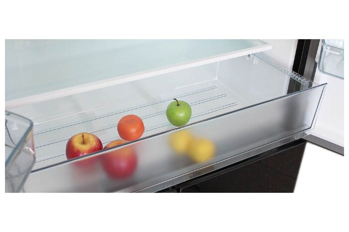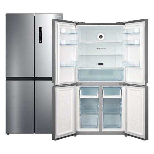 количество камер: трехкамерный; расположение морозильной камеры- снизу, размораживание морозильной камеры- No Frost, общий объем 460л, защита от детей, цвет: нержавеющая сталь