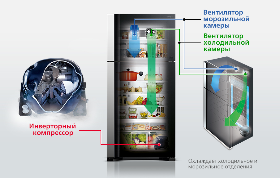 Холодильники Hitachi оснащены двумя вентиляторами, которые обеспечивают независимое охлаждение холодильного и морозильного отделений. Система обеспечивает быструю и эффективную циркуляцию холодного воздуха даже в труднодоступных местах.