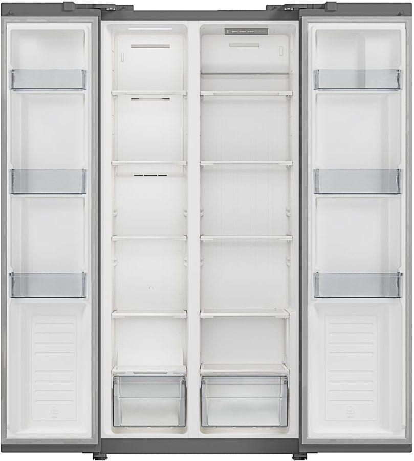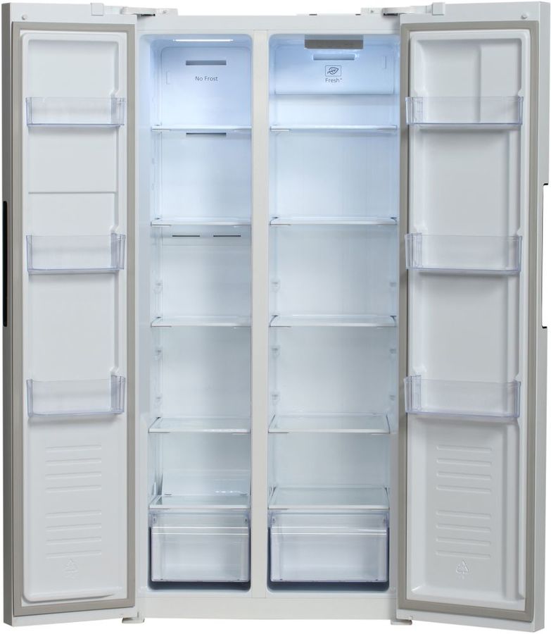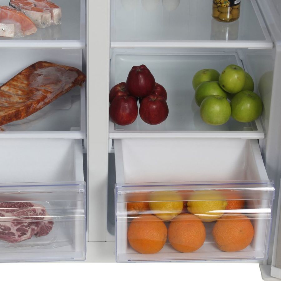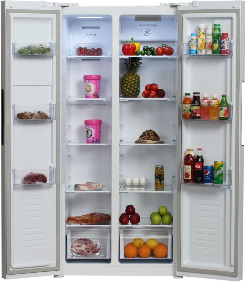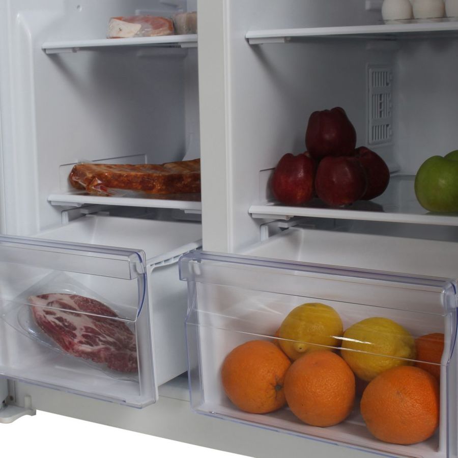 количество камер: двухкамерный; расположение морозильной камеры- сбоку (Side by Side), размораживание морозильной камеры- Total No Frost, общий объем 476л, защита от детей, цвет: белый