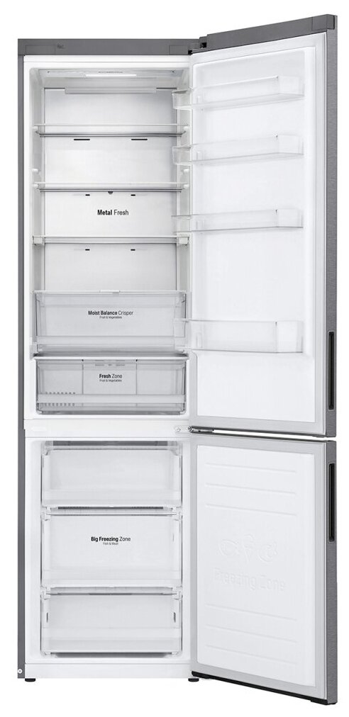 нулевой зазор, металлическая задняя стенка Metal Fresh; холодильная камера: крышка Moist Balance Crisper, лоток для яиц (1 × 10 яиц), 4 дверные корзины с металлической окантовкой