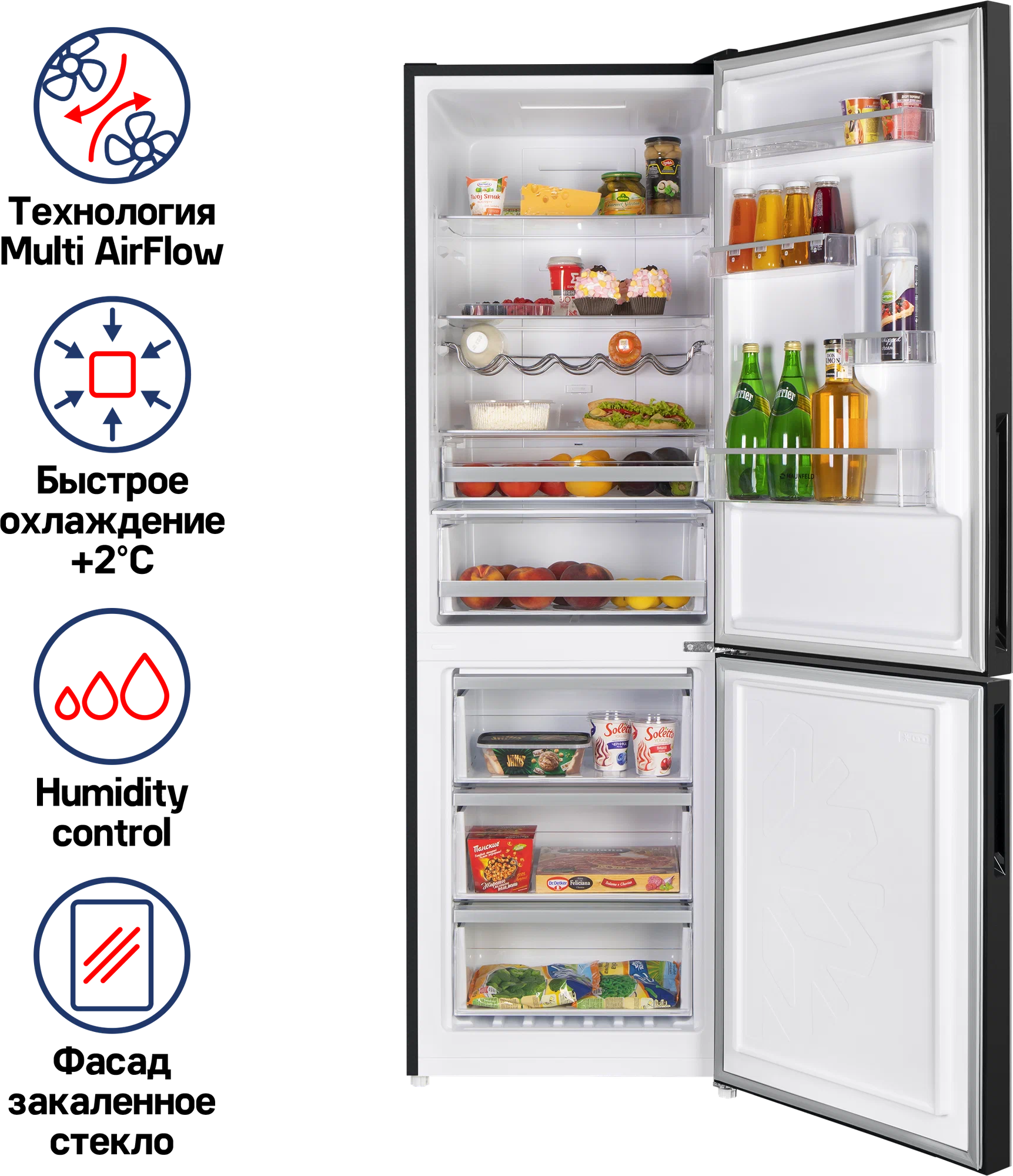 индикация температуры, система контроля влажности, Full No Frost, Антибактериальное покрытие камеры, Светодиодная подсветка, Скрытые ручки, Суперзаморозка