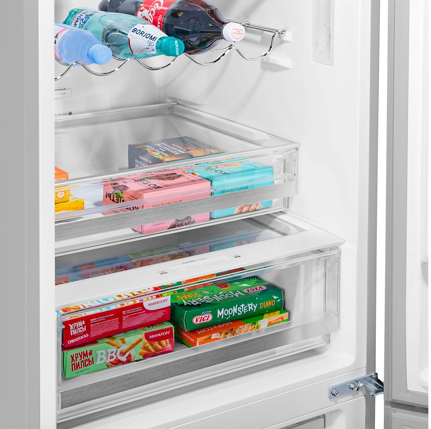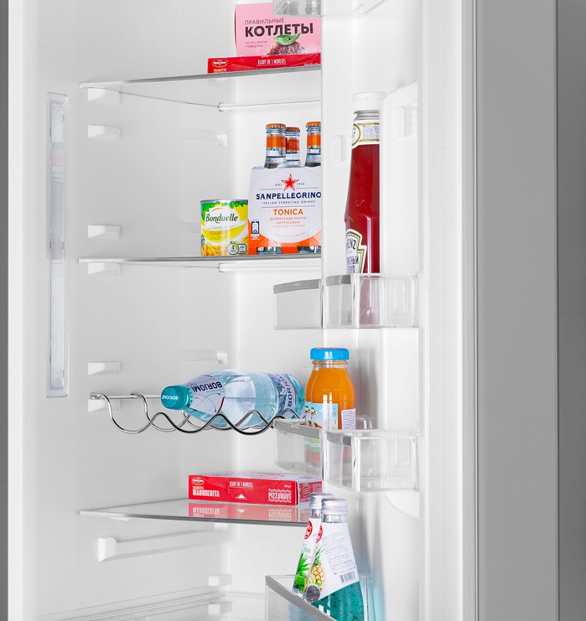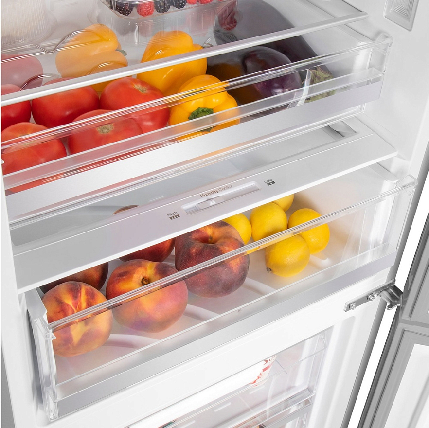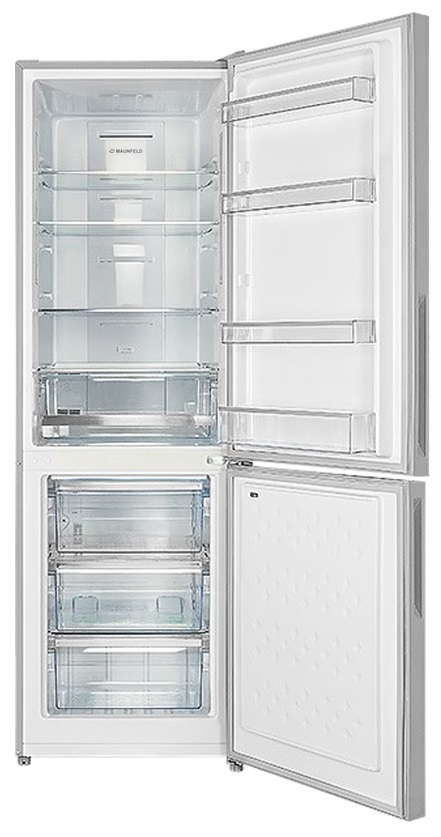 Холодильник Maunfeld MFF185NFS это двухкамерный прибор, выполненный в белом цвете. Классический дизайн подойдет к абсолютно любому кухонному интерьеру и дополнит его. Модель имеет стандартные габариты, поэтому будет удобна для встраивания. Высота устройства — 185,5 см, ширина — 59,5 см, глубина — 64,5 см. В его основу положен надежный и экономичный инверторный компрессор, соответствующий классу А+. Классификация по уровню энергопотребления дает объективное представление о том, насколько эффективно прибор расходует данный ресурс. Холодильник Maunfeld MFF185NFS оборудован дисплеем с цифровой индикацией температуры и настроек. Управление техникой осуществляется с помощью сенсорных переключателей. Помимо этого, светодиодная подсветка ярко освещает внутреннее пространство камеры и отличается долговечностью.